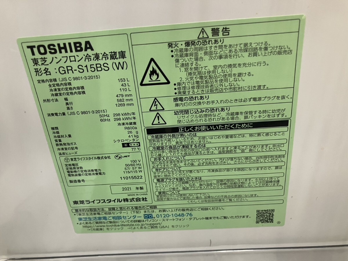 【美品】大阪引取限定 東芝 2ドア冷蔵庫 GR-S15BS(W) 153リットル