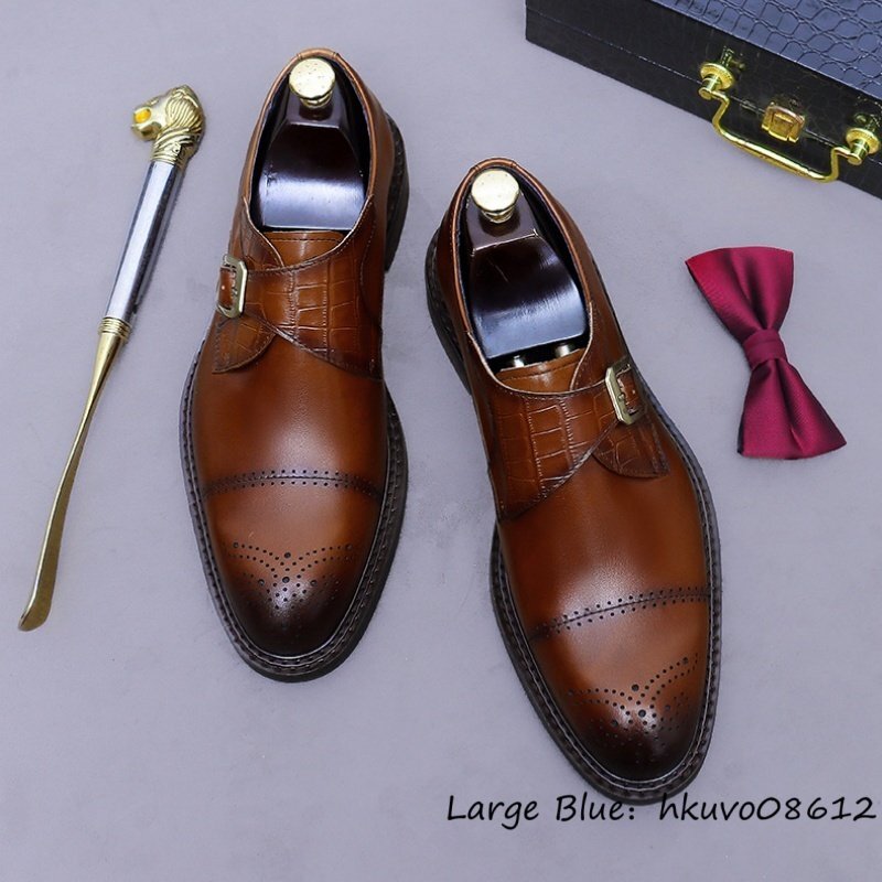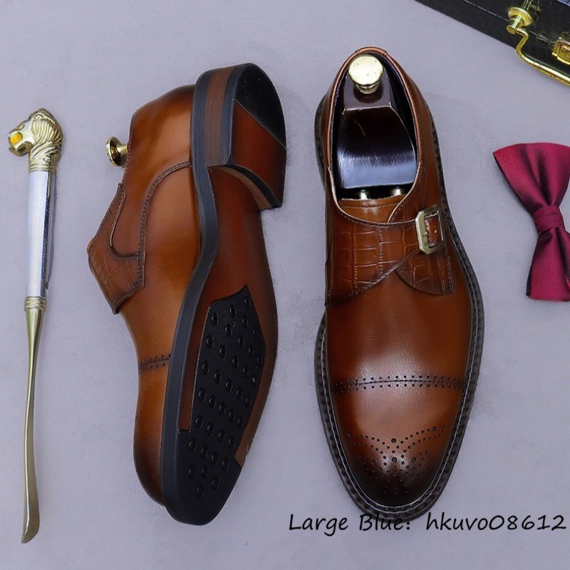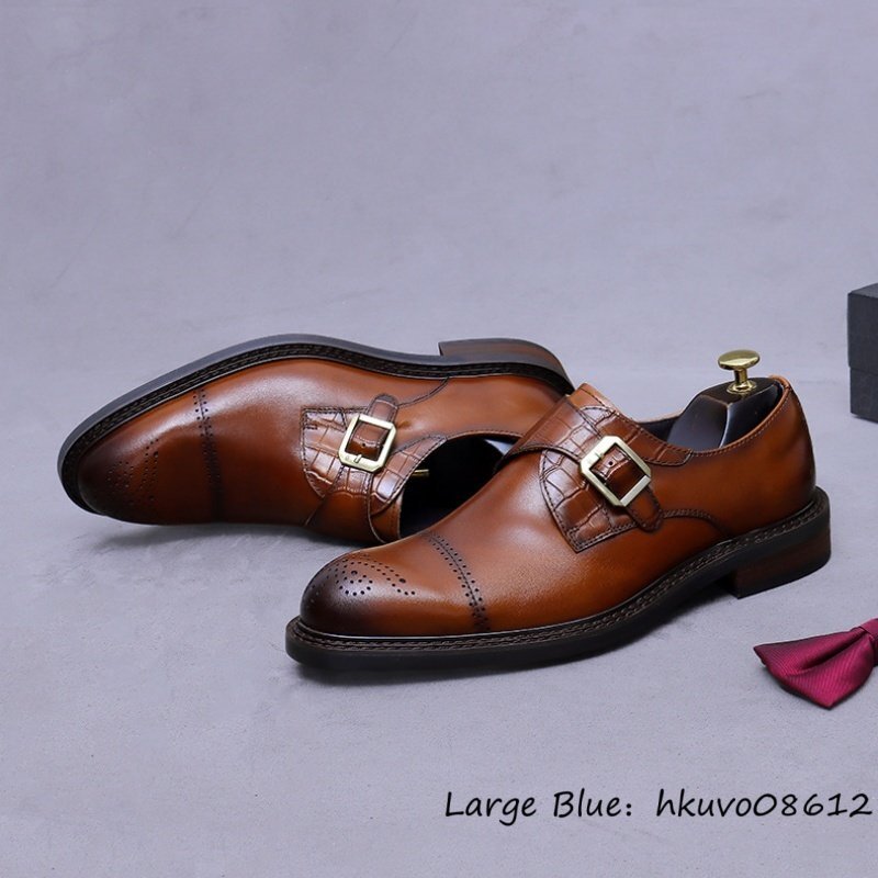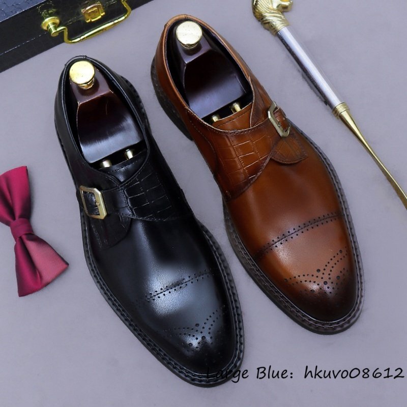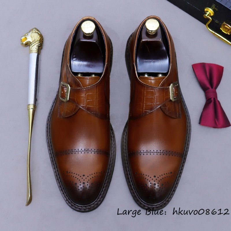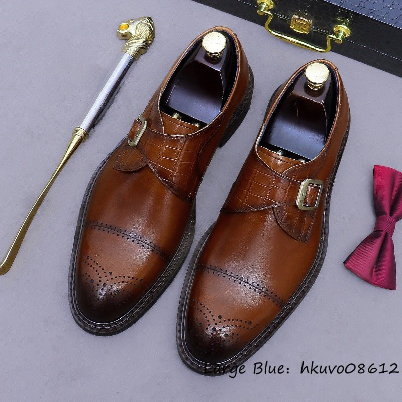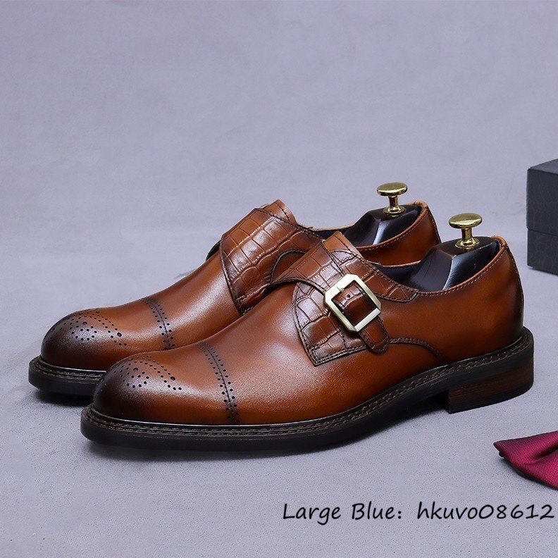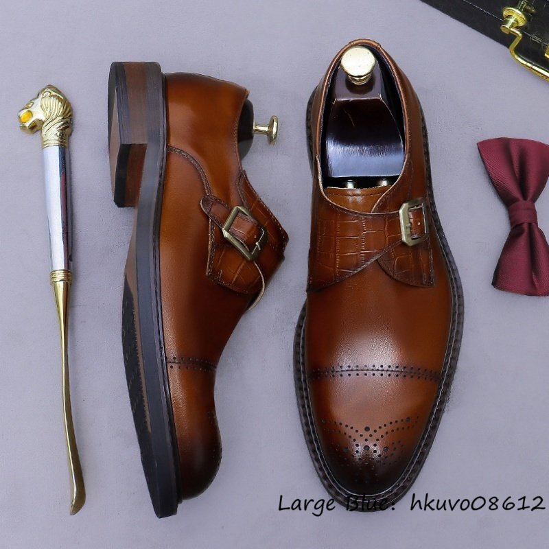 定価9万超◆ビジネスシューズ メンズ 職人手塗仕上げ 彫り 本革レザーシューズ モンクストラップ 紳士靴 革靴 最高級 牛革 ブラウン 27.5cm