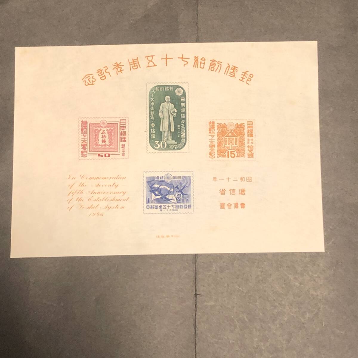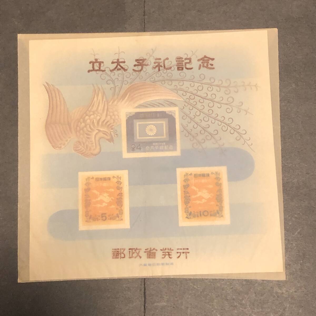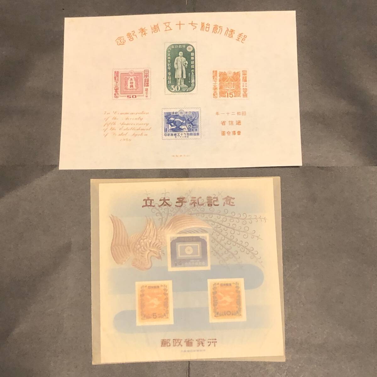 K019 1946年 郵便創始75年 1952年 立太子礼 小型シート 硫酸紙袋付き 計2点
