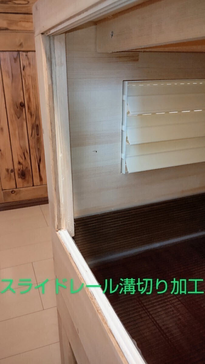 表側は、軽さと安全面を考え、透明なアクリル板(3ミリ厚)スライド窓。ペットが戸を開けるのを防止【側面溝切り】