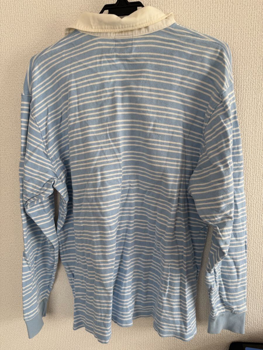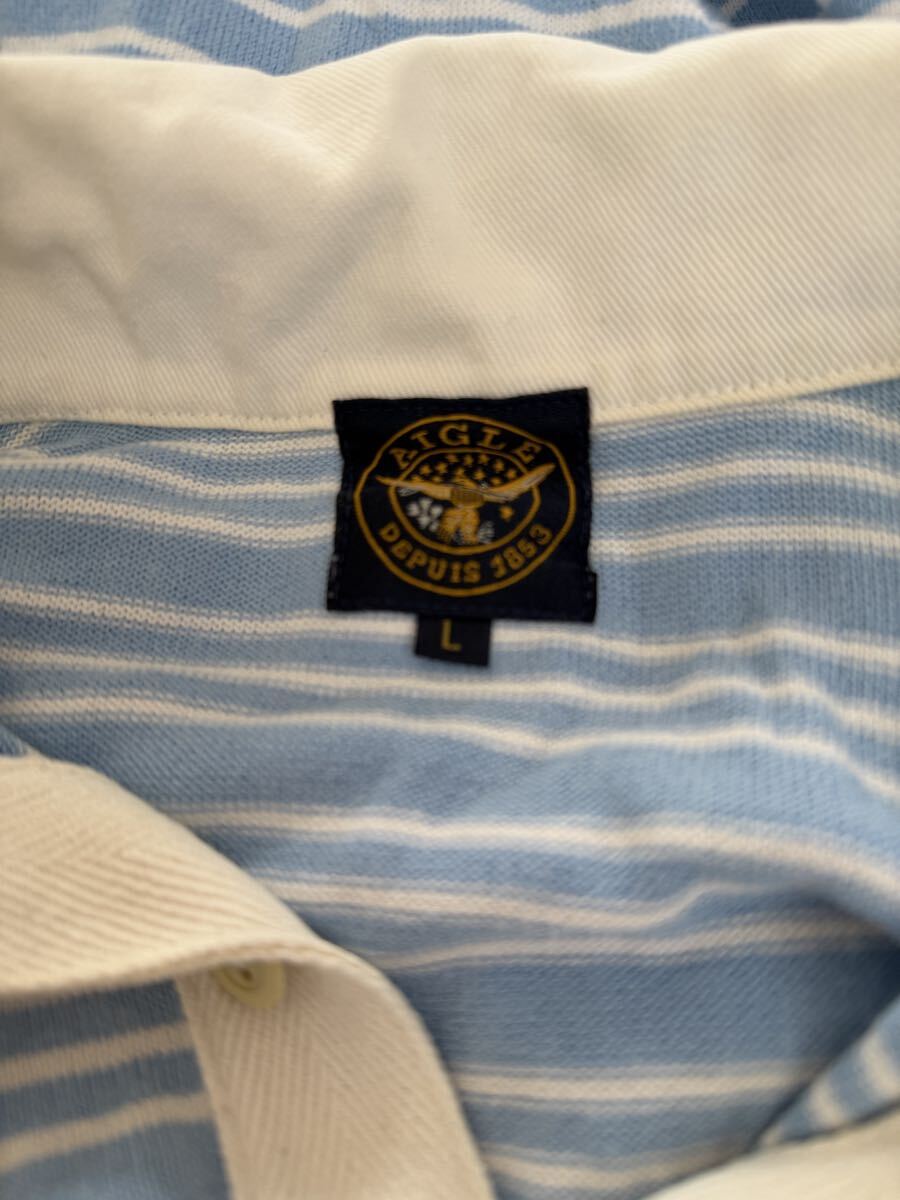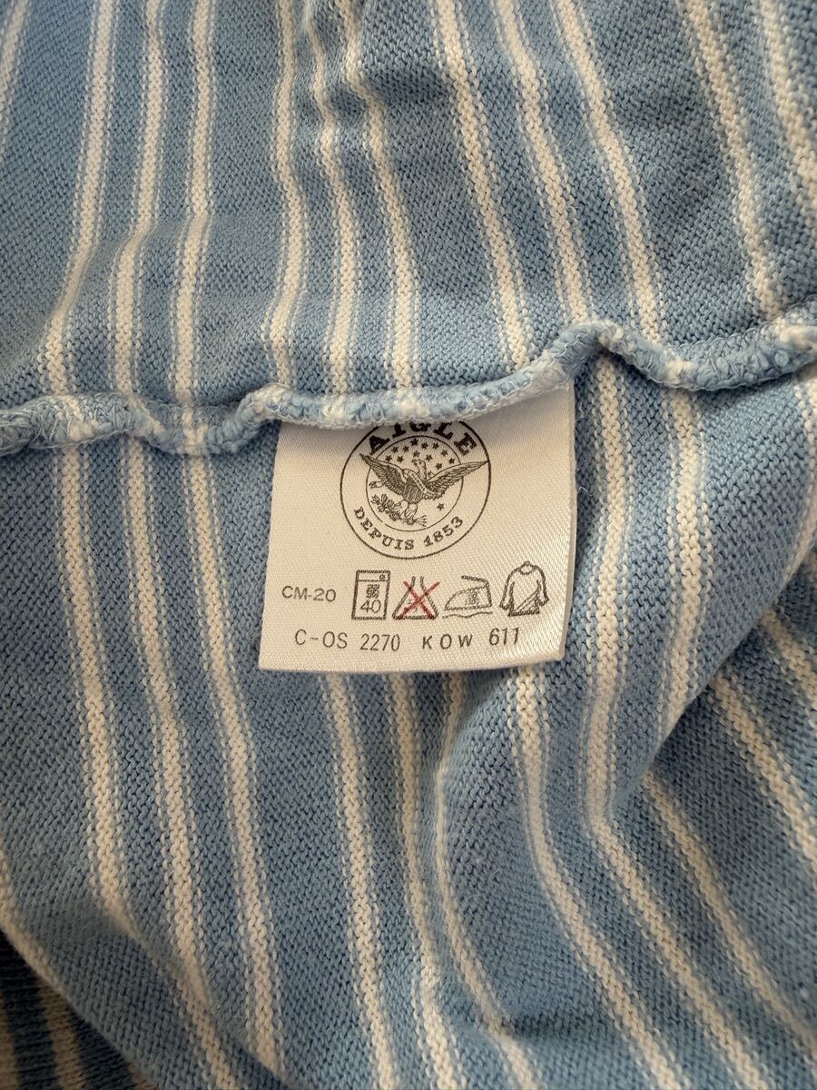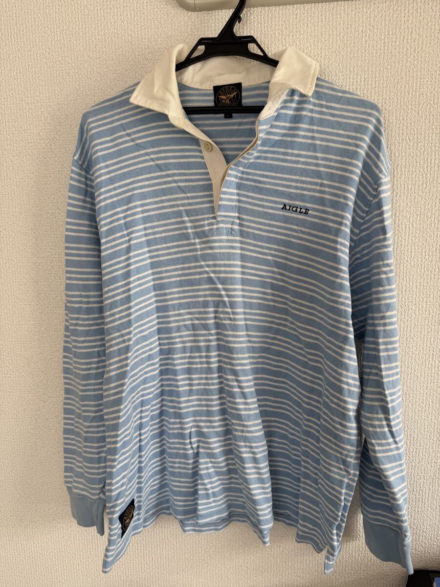 水色と白のストライプの長袖ポロシャツ、AIGLEのLサイズ 古着 USED