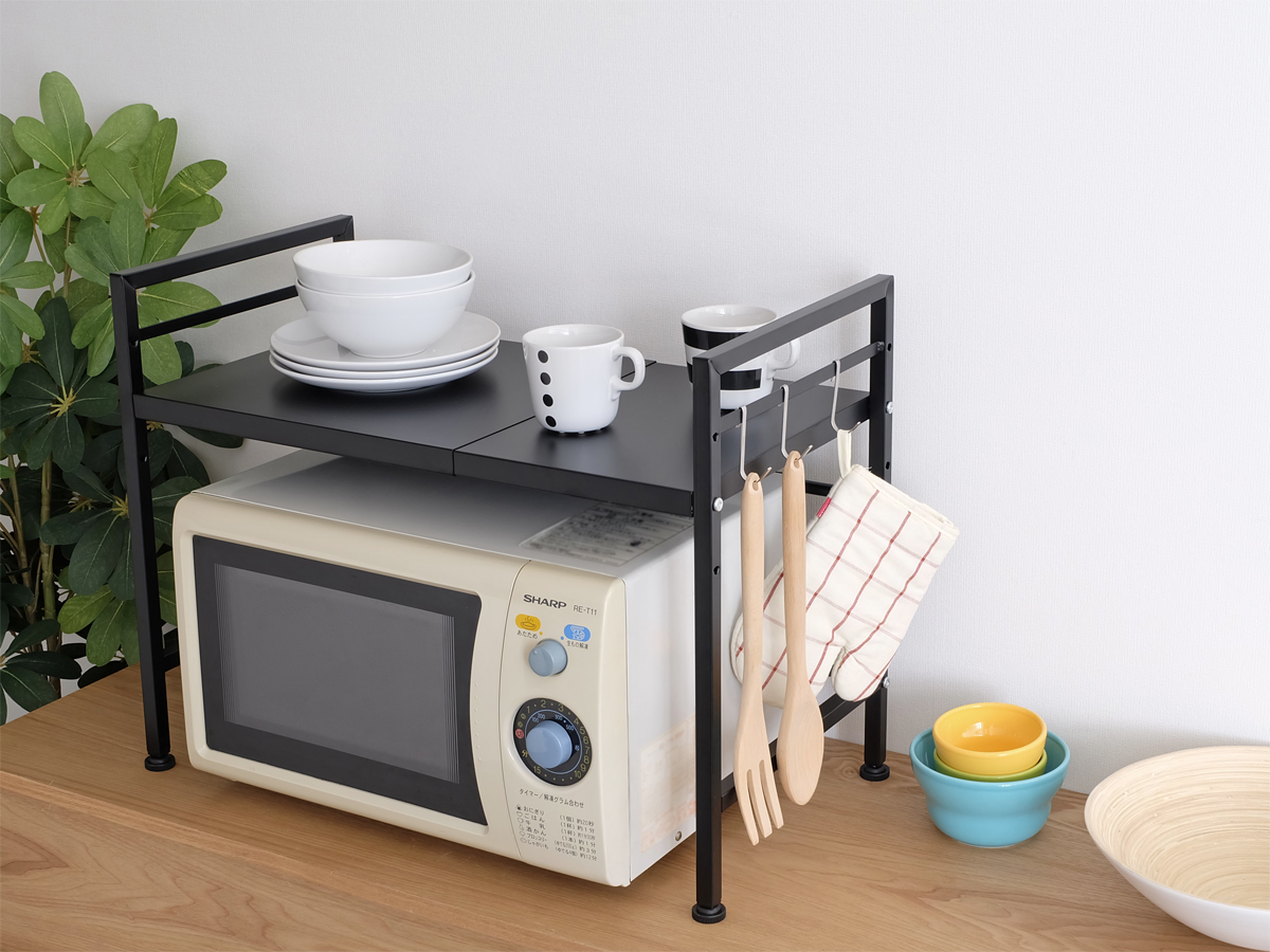 商品説明 デッドスペースになりがちな電子レンジ上を有効活用できる伸縮キッチンラック"Molly(モリー)"