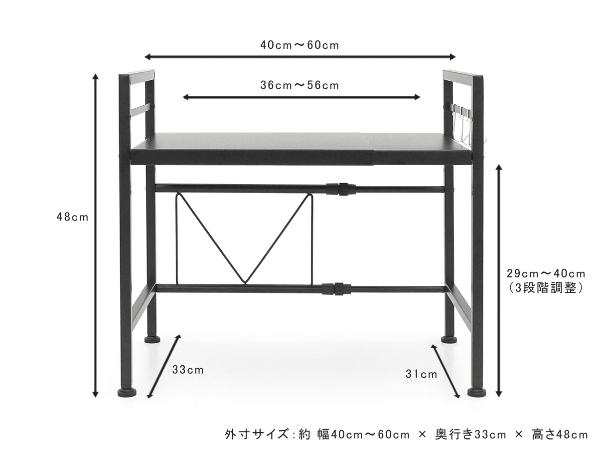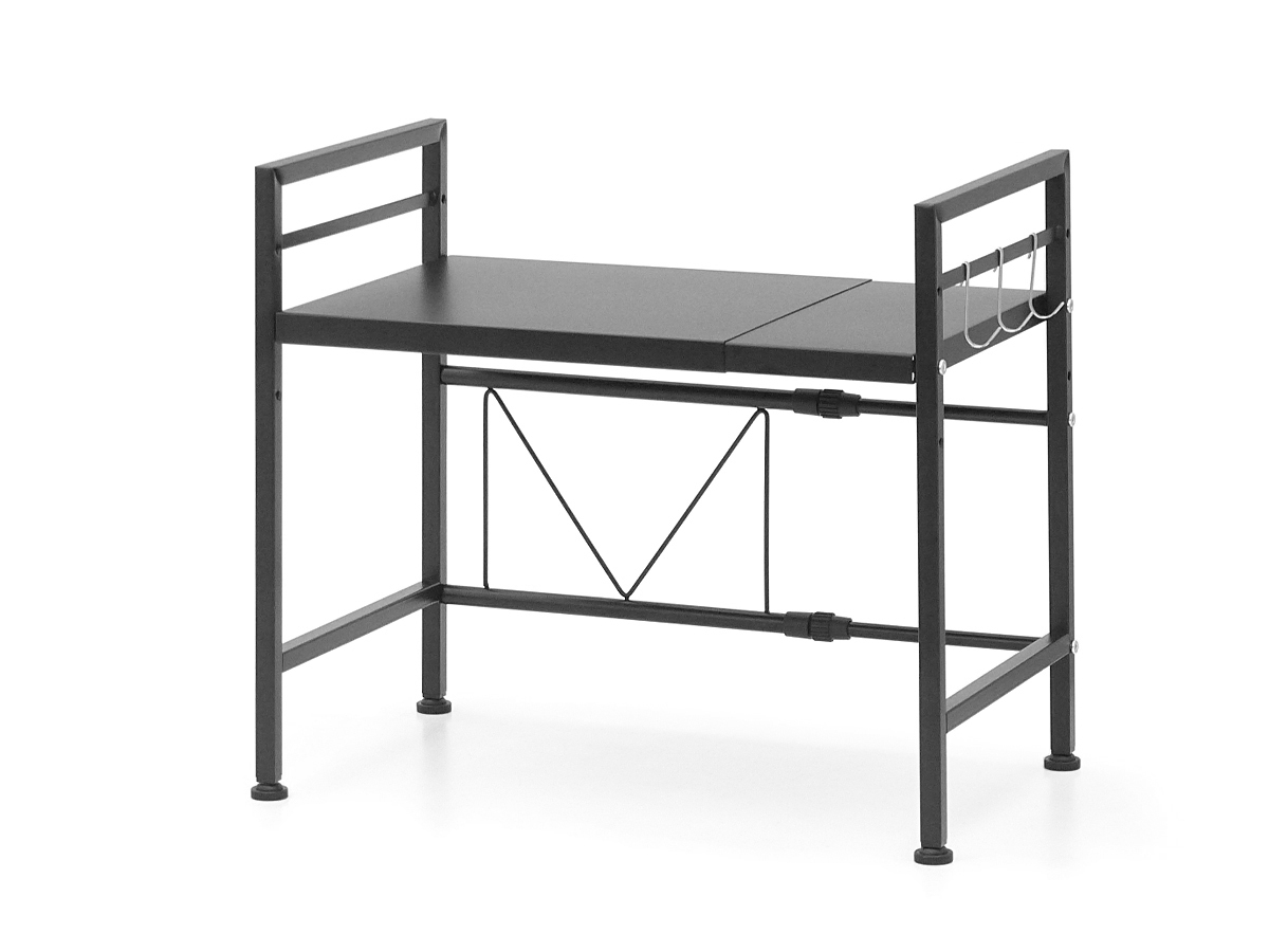 約40cm~60cmまで幅の調整が可能な伸縮タイプで、棚板の高さも3段階に調整可能となっています。