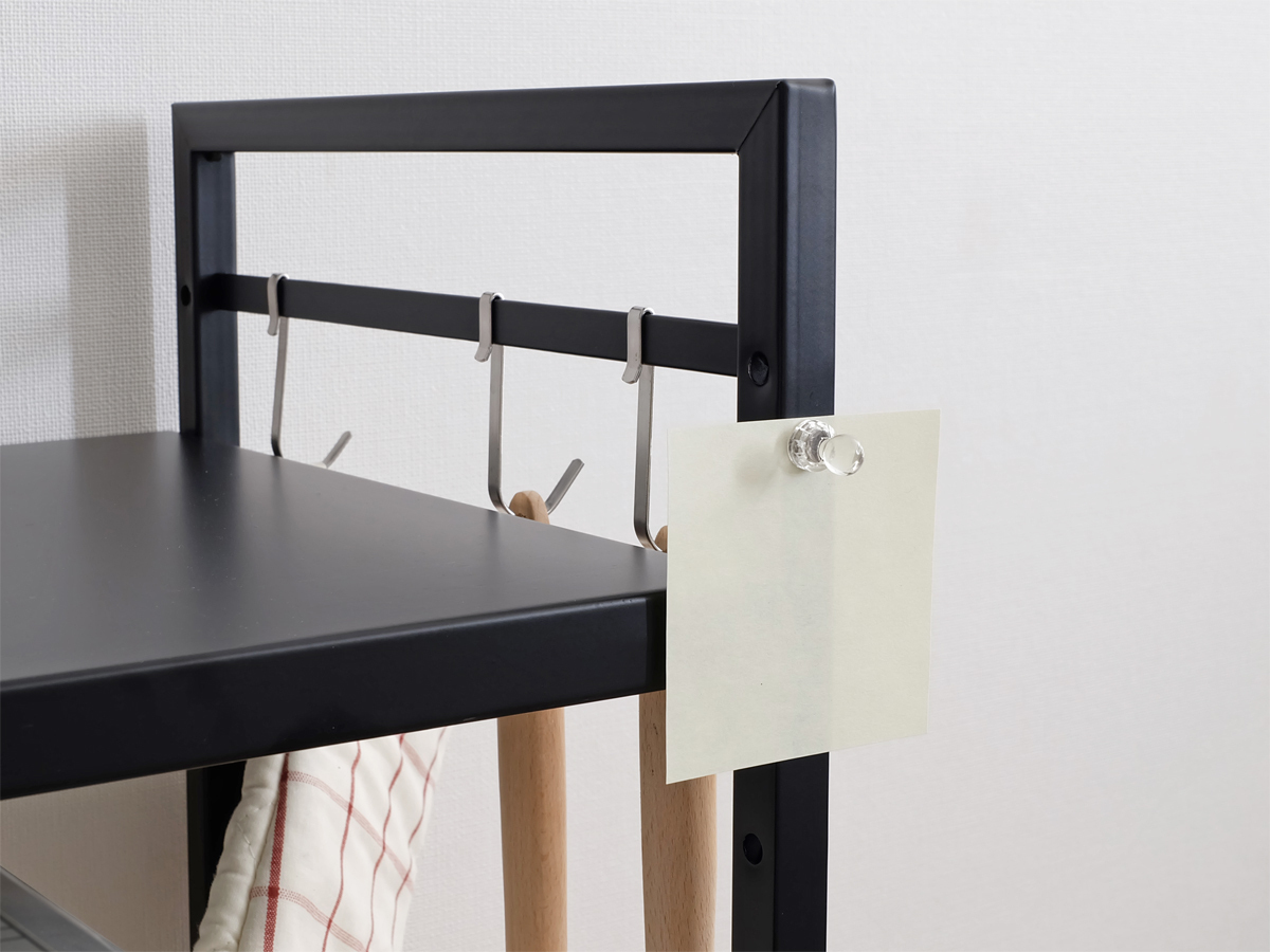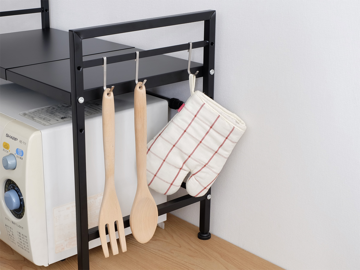 調理器具やミトンなどを吊り下げるのに便利な専用フックも3つ付属していますので、