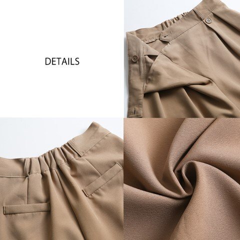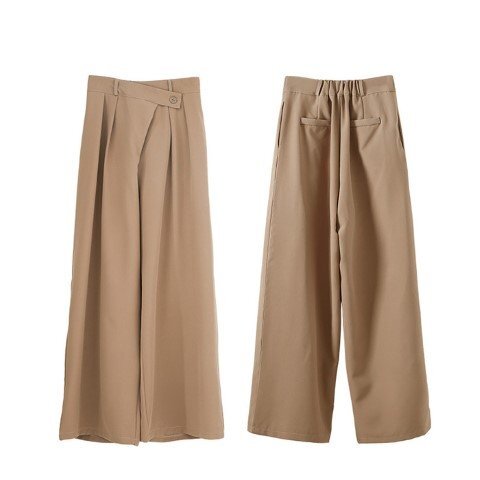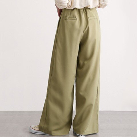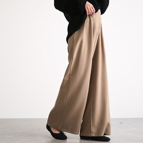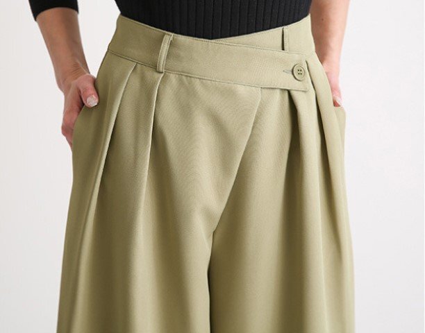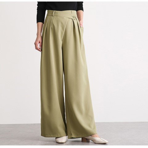 ・スタイルアップが叶うワイドパンツ。フロントのデザインがラップ風でお洒落な印象に仕上がります。