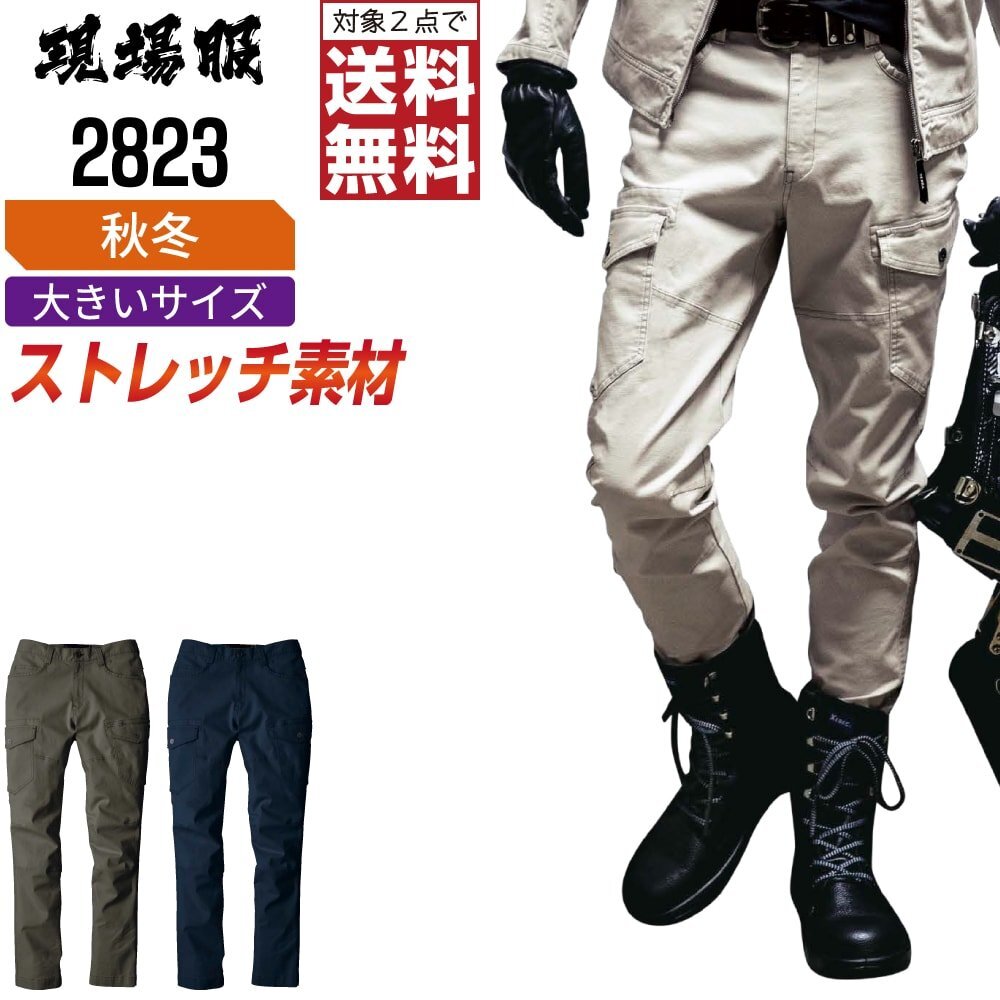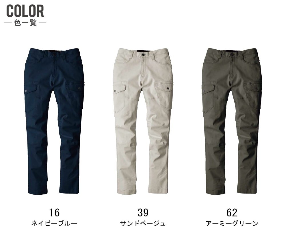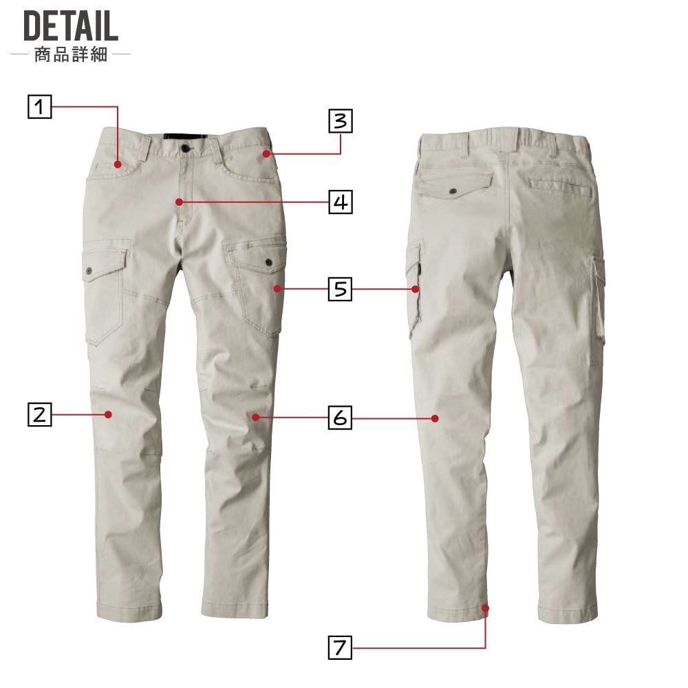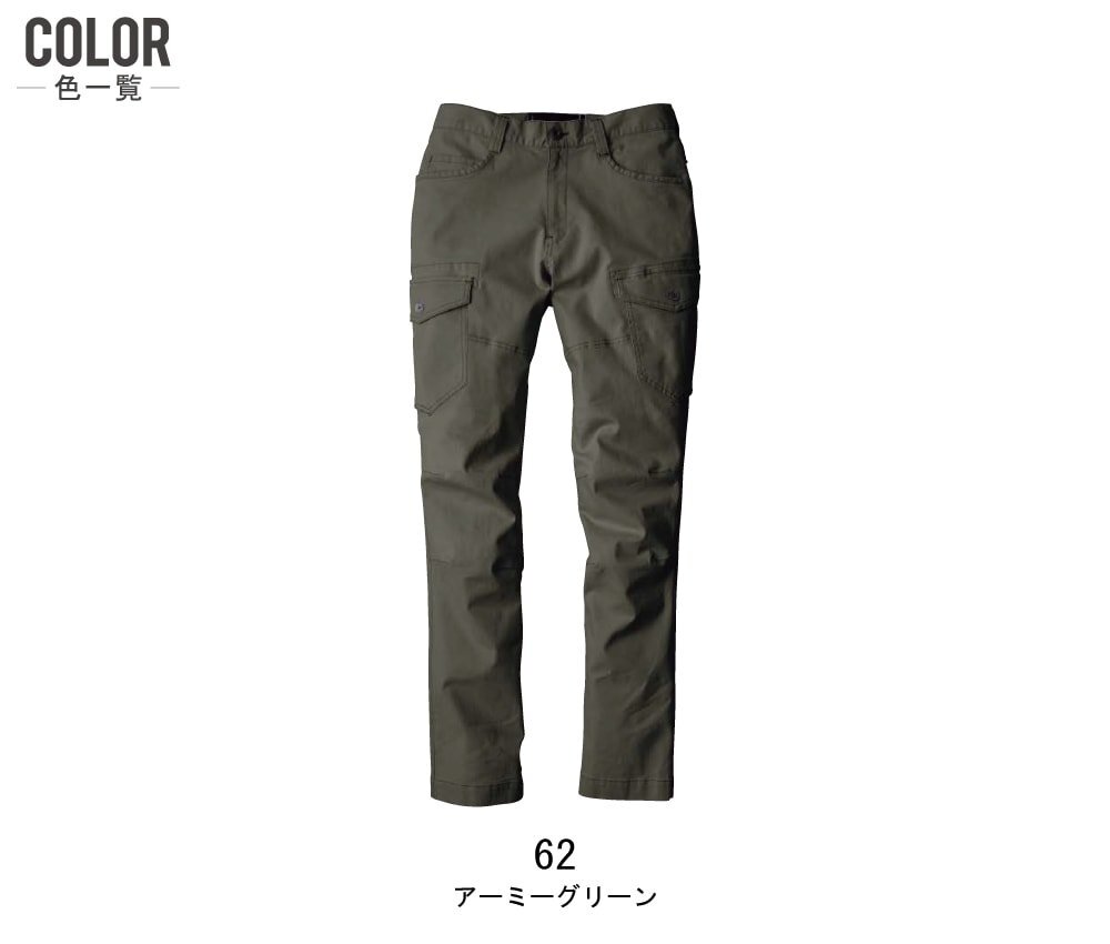 仕様:ストレッチ/ヒザダーツ/両脇フラップ付きカーゴポケット/裾内側スピンドル通し穴