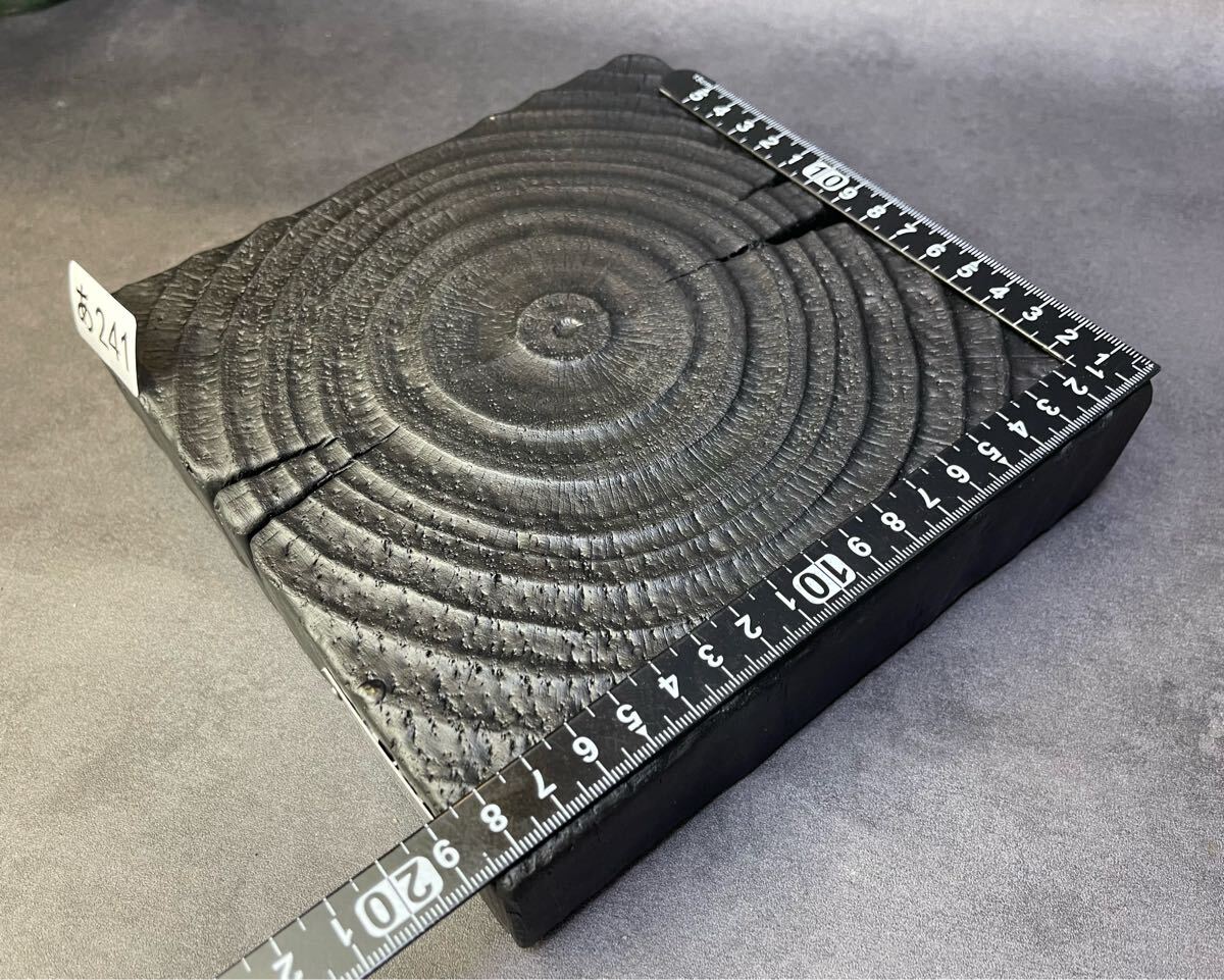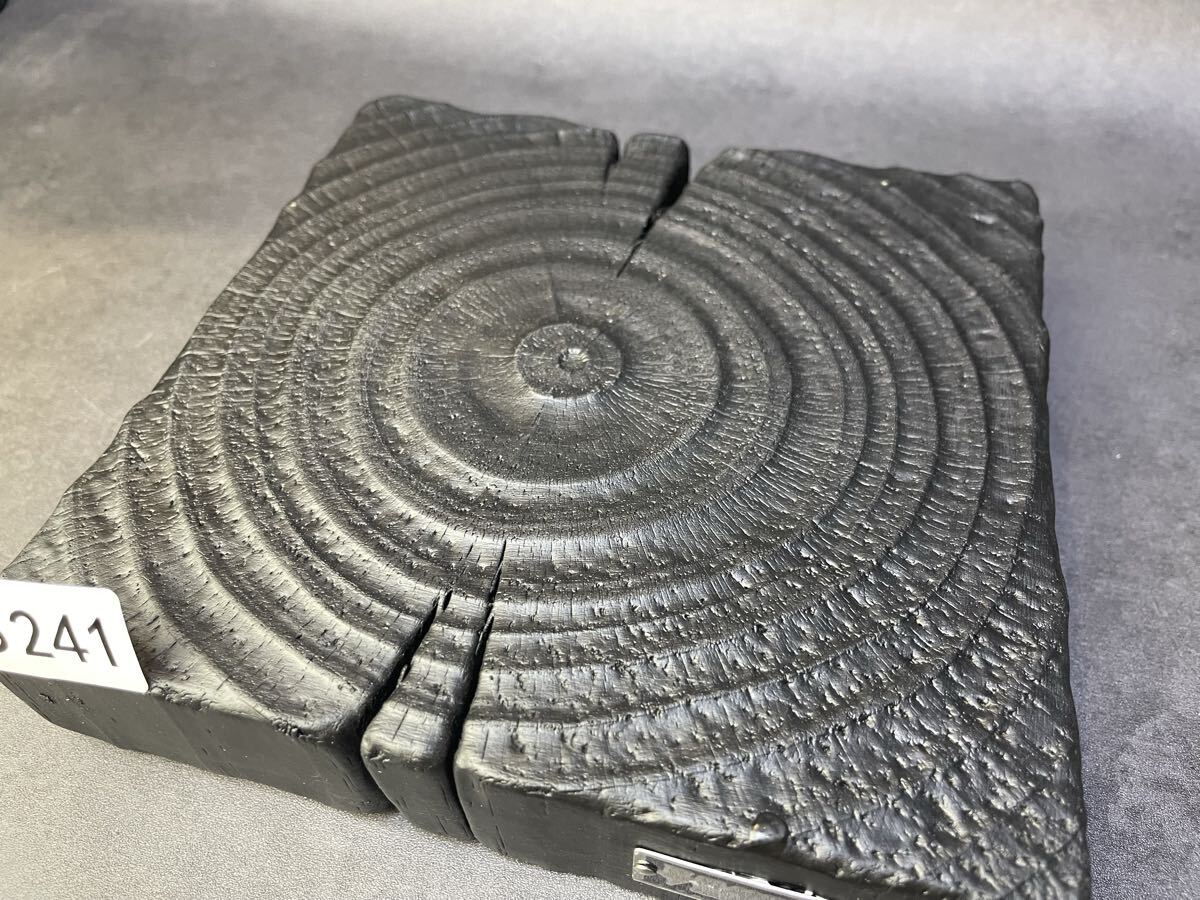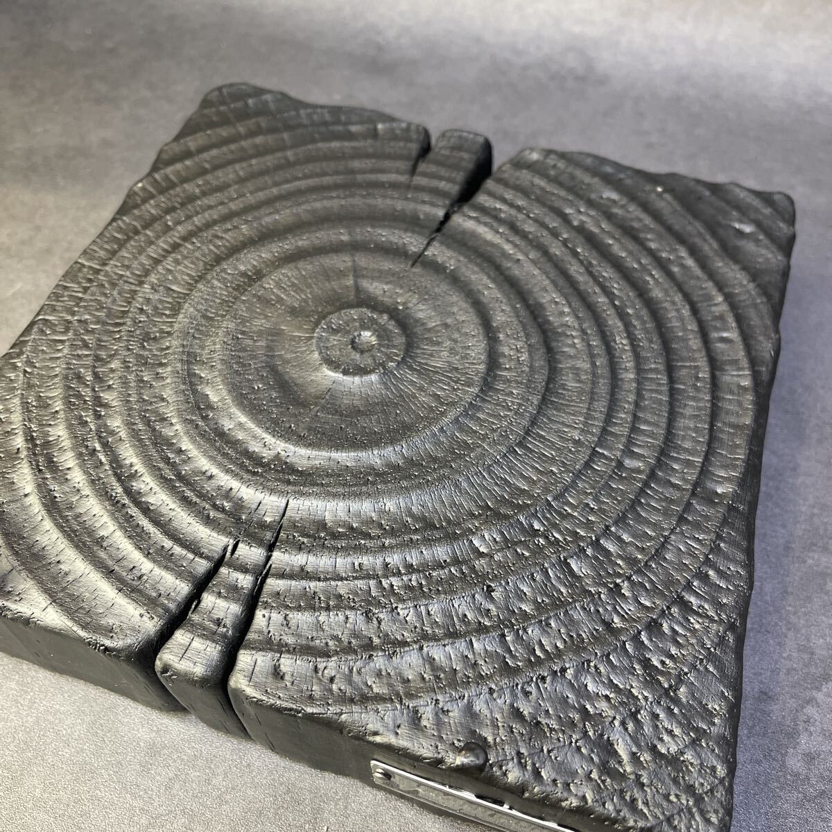南方杉の芯材を炭火で焼き締め、割れ・焦げ・年輪の表情をそのまま“造形”として残した一点製作。手工製のため同じものは存在しない、完全唯一の花台です。上面は黒炭の緊張感、裏面は年輪が浮かぶ天然のコントラスト。