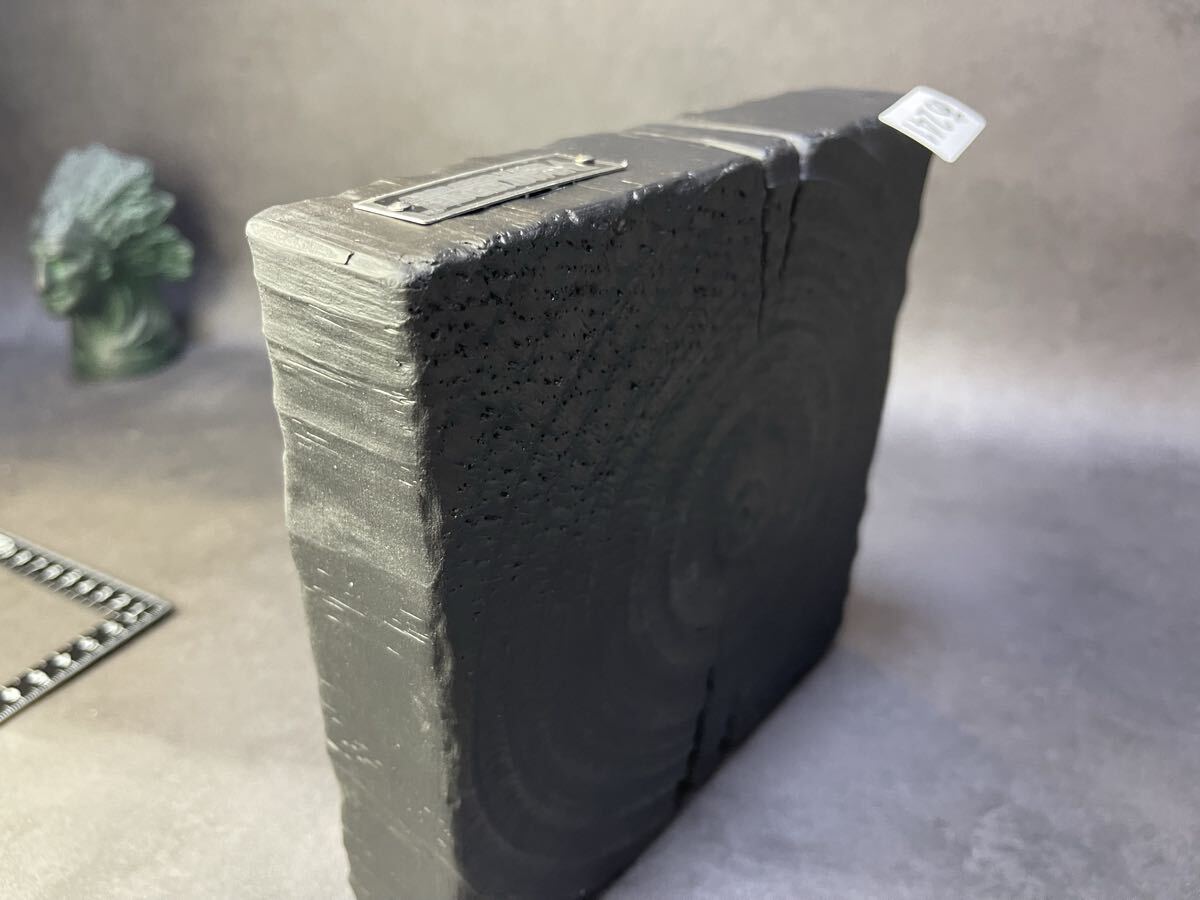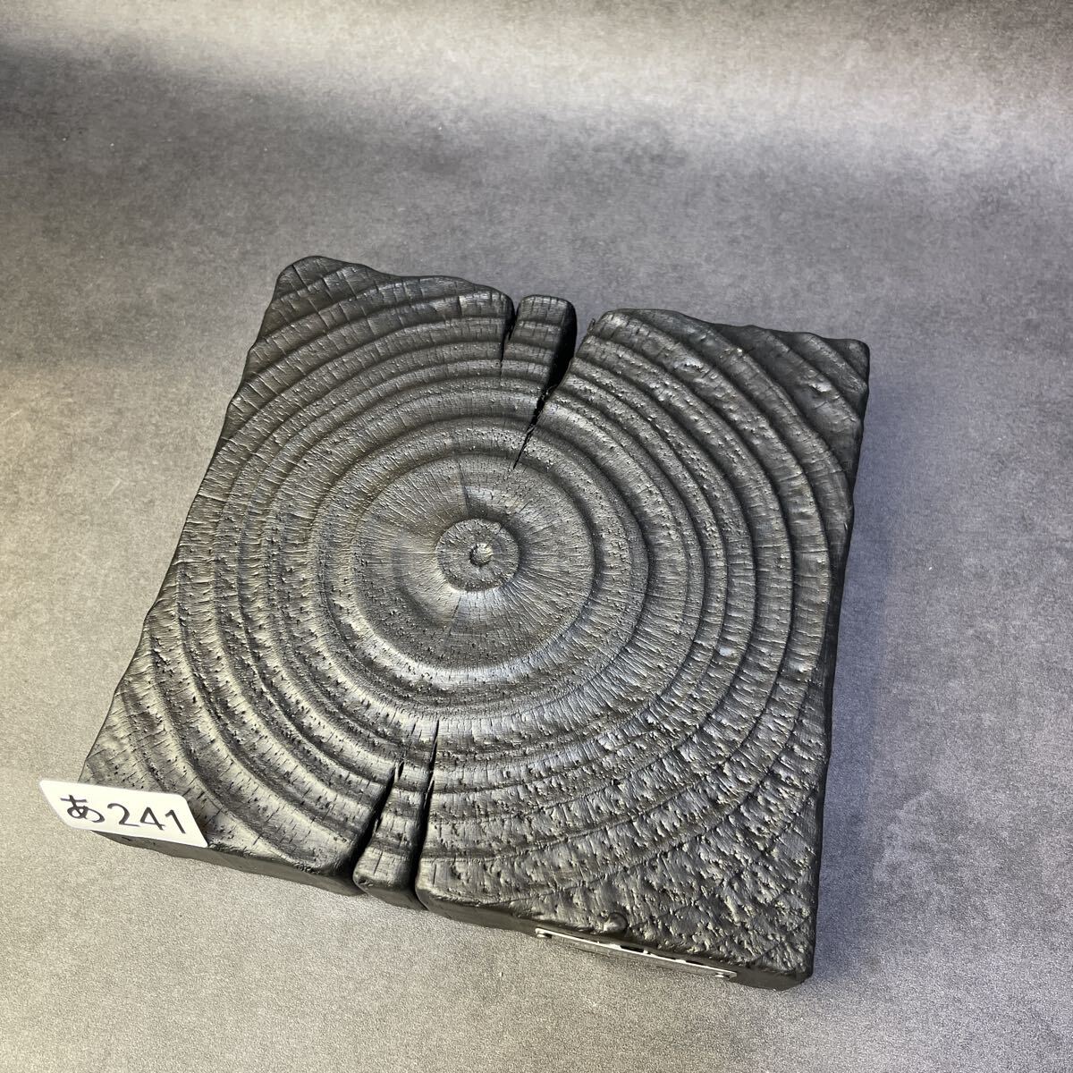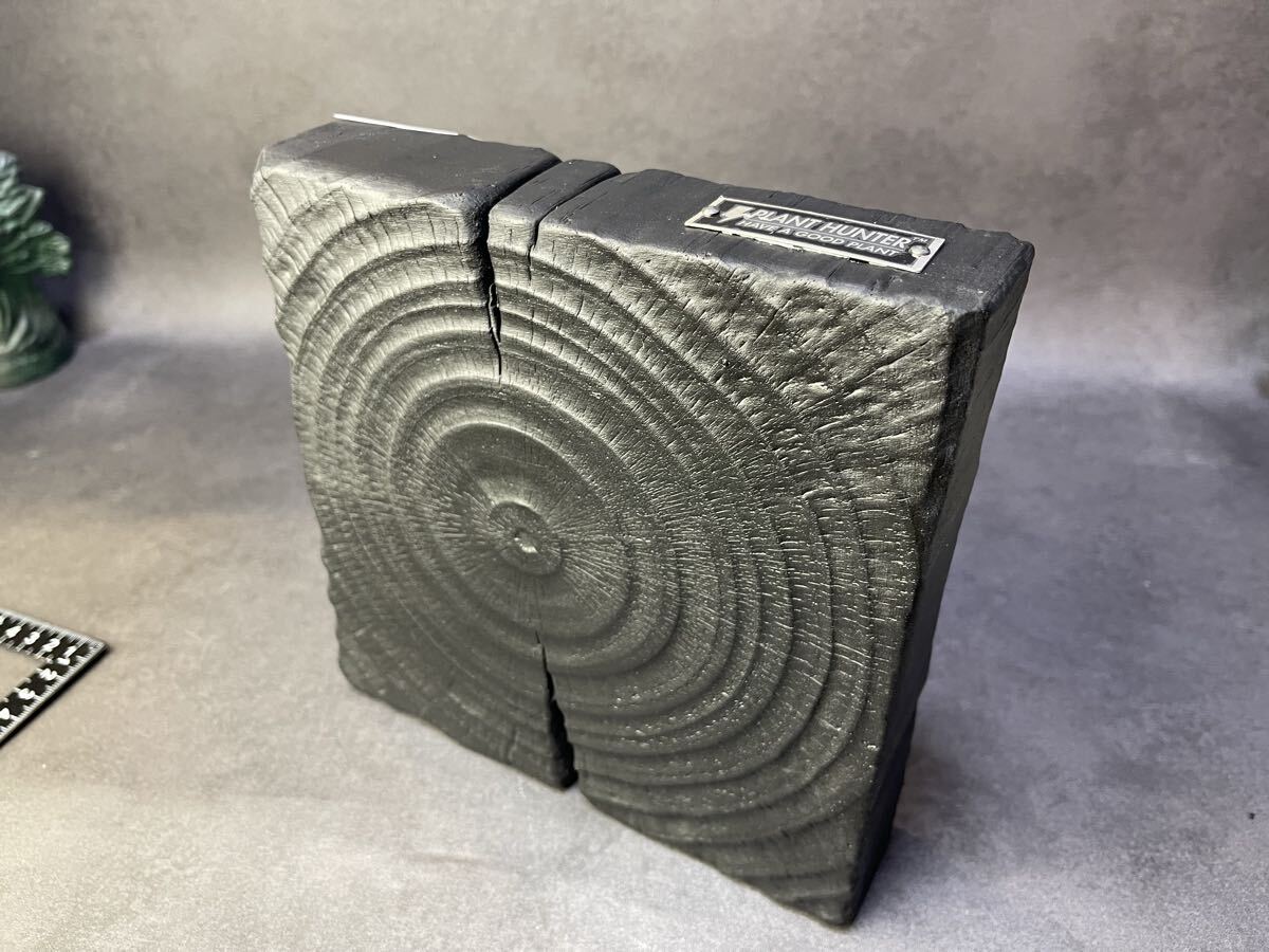 南方杉の芯材を炭火で焼き締め、割れ・焦げ・年輪の表情をそのまま“造形”として残した一点製作。手工製のため同じものは存在しない、完全唯一の花台です。上面は黒炭の緊張感、裏面は年輪が浮かぶ天然のコントラスト。