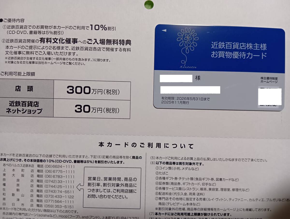| 商品説明 | ★最新 近鉄百貨店 株主優待カード ご優待クーポン券 男性名義になります。 ★有効期限 2026年5月31日 ★利用案内に「本カードはご名義人様のほか、ご名義人様のご家族様がご利用いただけます。」とあります。 |