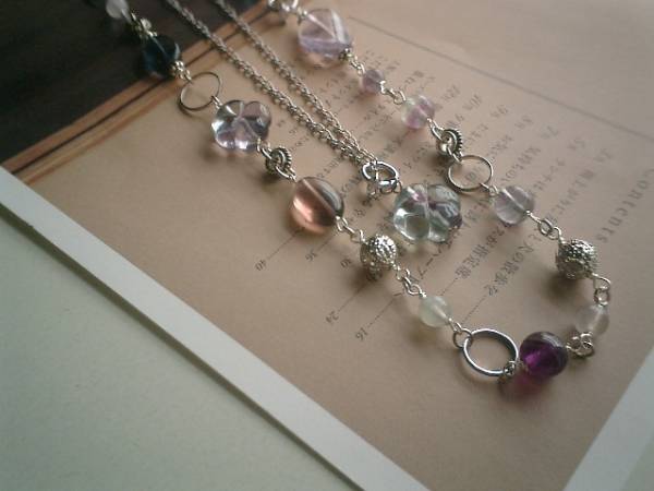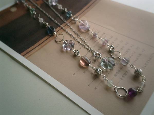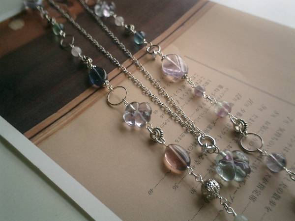 アート・クチュール・・シリーズです♪可憐なクローバー・・神秘的なフローライトのネックレス2本セットです♪儚げなお色がロマンチックな表情です♪6ミリ、8ミリの丸玉、14×10ミリのオーバル、18×13ミリのツイストオーバルなどデザイン違いのフローライトに12ミリの四葉のクローバーのフローライトやデザインメタル、透かしチャーム、ドールリングを合わせて大人のロマンチックしています♪長さは全長108センチ位で調節自由です♪2連にされても素敵です♪繊細なチェーンのネックレスのトップは12ミリのクローバーデザインのフローライトとドールリングです♪長さは68センチ位で調節自由です♪それぞれ単品やブレスレットも出品しています♪♪シンプルで長く着けていただけるデザインを考えて作りました♪ハンドメイドをご理解頂いてノークレーム、ノーリターンでお願いします
