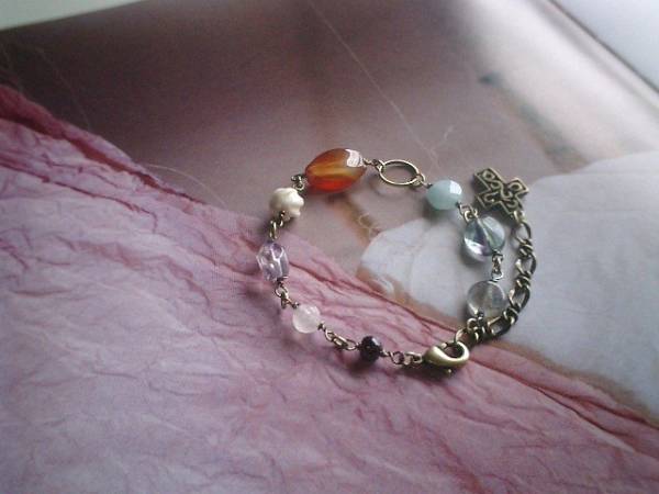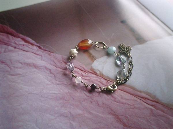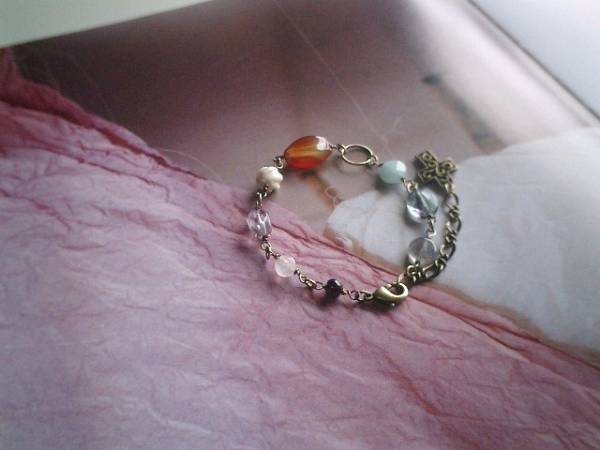 仏蘭西映画の余韻・・シリーズです♪宝石箱をイメージして・・アメジスト、カーネリアン、フローライト、アマゾナイト、ガーネット、ラブラドライトなど繊細で可憐な石を集めてロマンチックな表情のブレスレットです♪ラフカットやナツメ、オーバルカット、スクエア、丸玉、コインカットなどデザイン違い、大きさ違いです♪長さは全長23センチ位で調節自由です♪♪お揃いのネックレスも出品しています♪ハンドメイドをご理解いただいてノークレーム・ノーリターンでお願いします♪