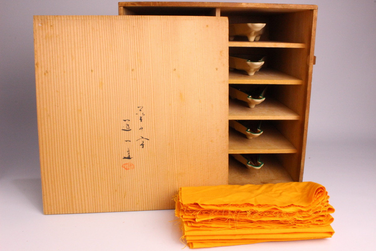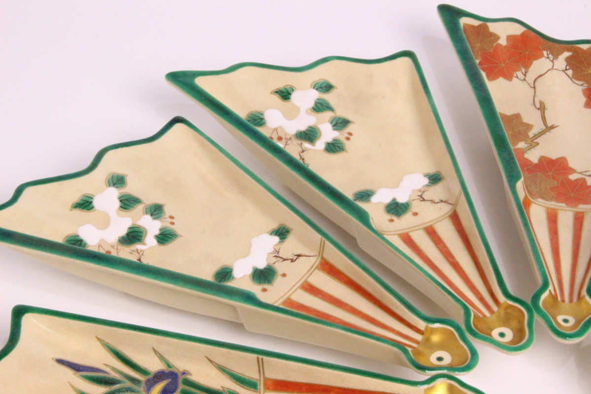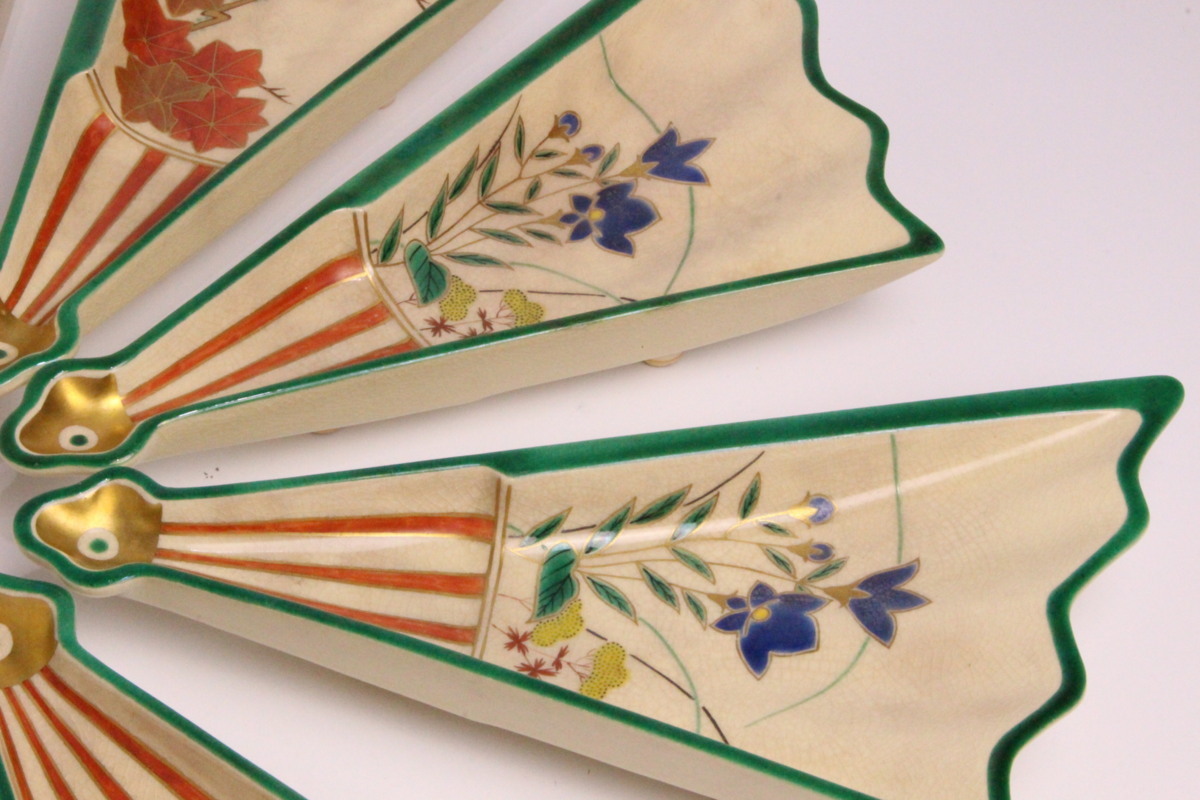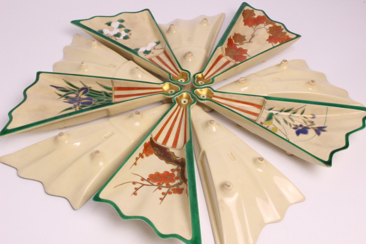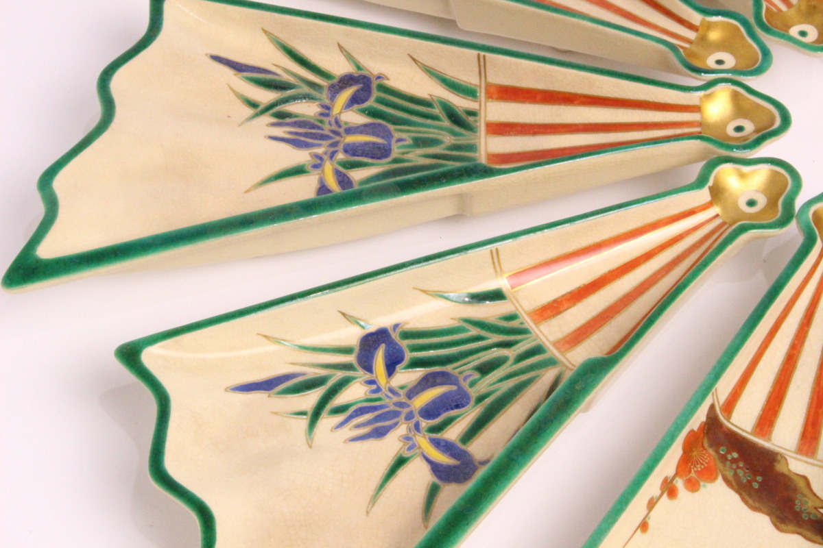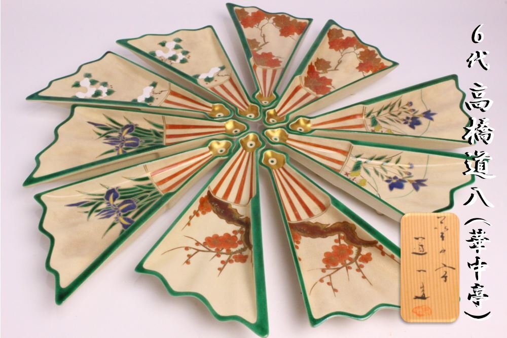 6代 高橋道八 色絵画 変扇面底 皿 10枚「共箱」