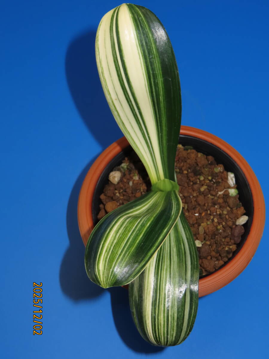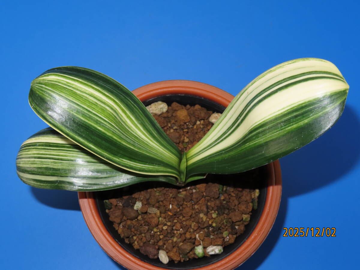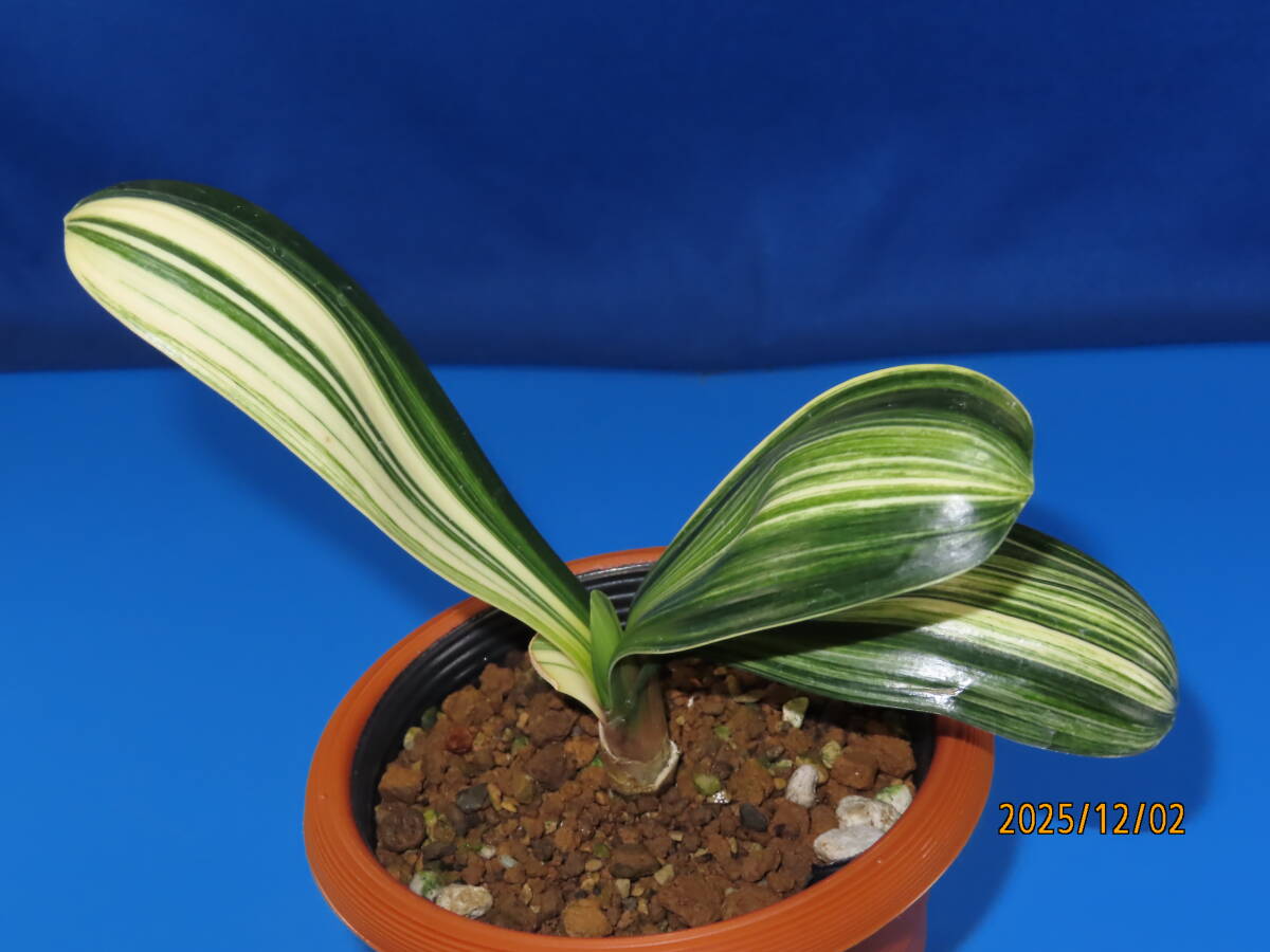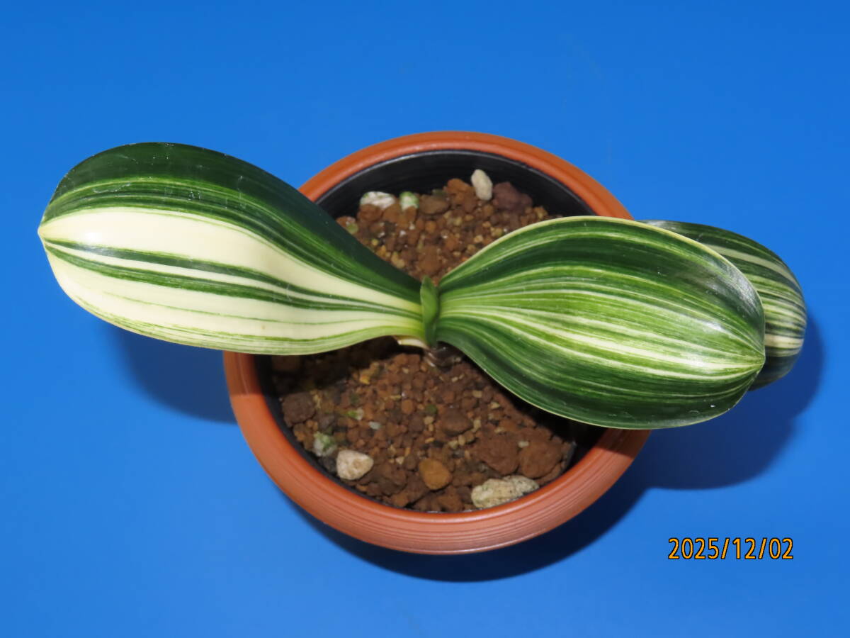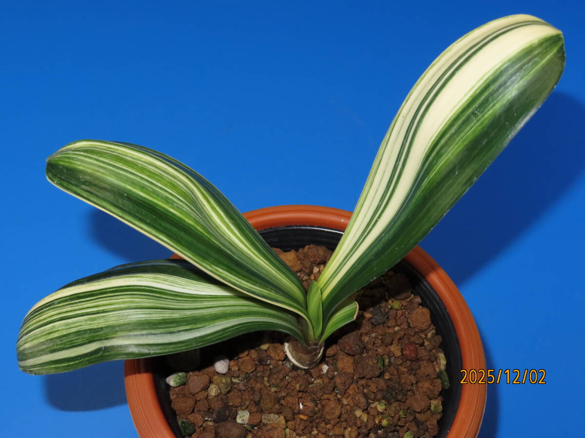 クンシラン(橙赤色花)白縞斑入りの株で、縞斑×ダルマの交配種です。