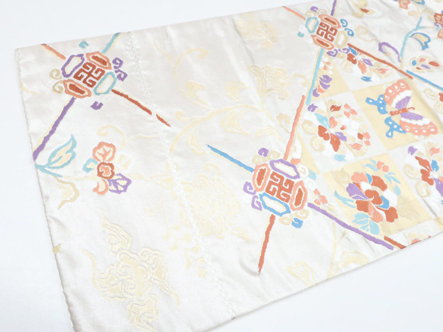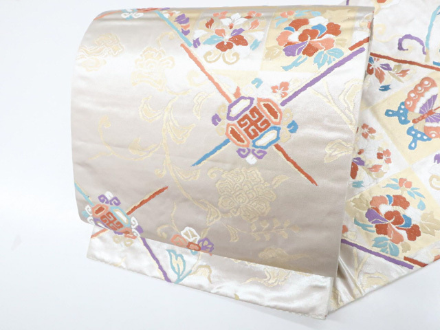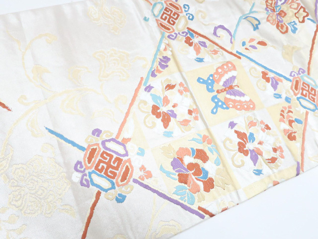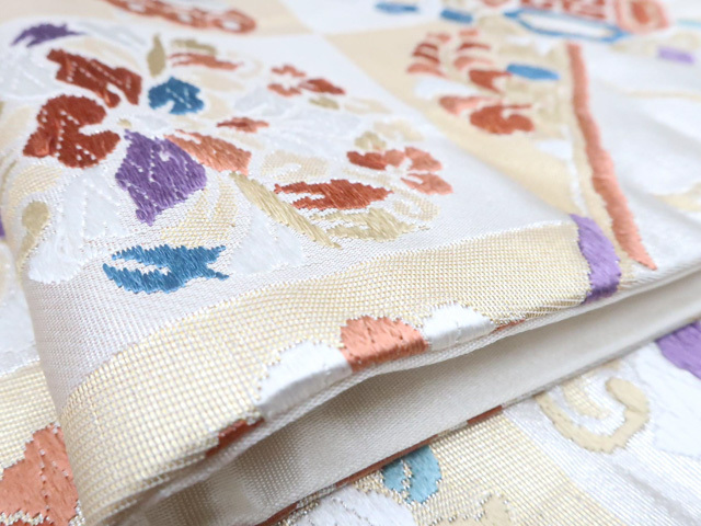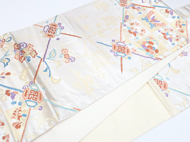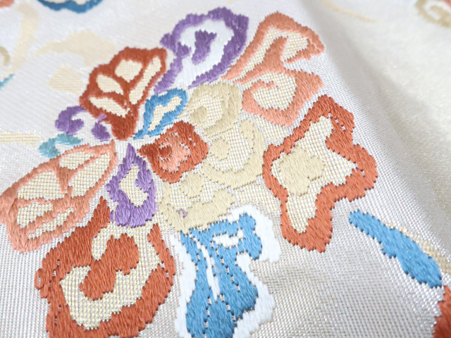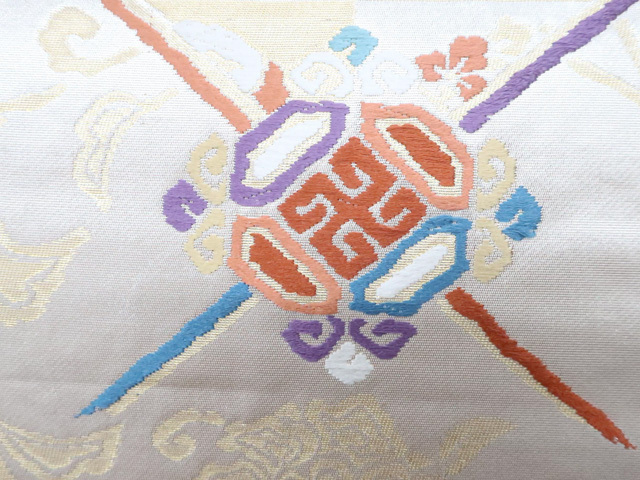 リサイクル商品の為、太鼓下に糸飛び出し、無地場にシミ、折山に汚れ、箔ホシがございますがご着用いただけると存じます。 地色はシルバーです。 1枚目の画像が近いお色かと思われます。 素材は正絹です。 |