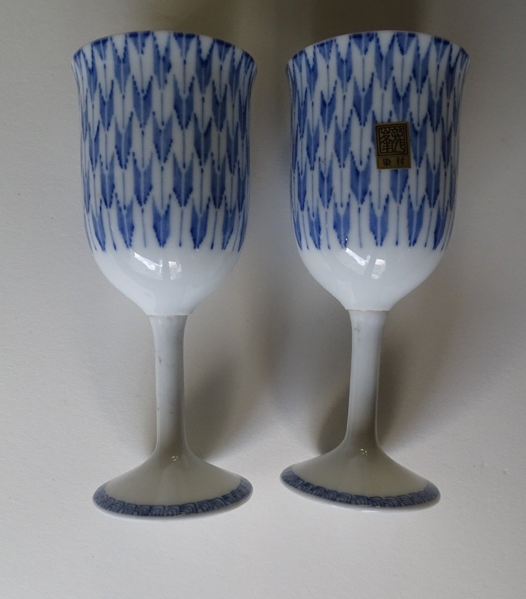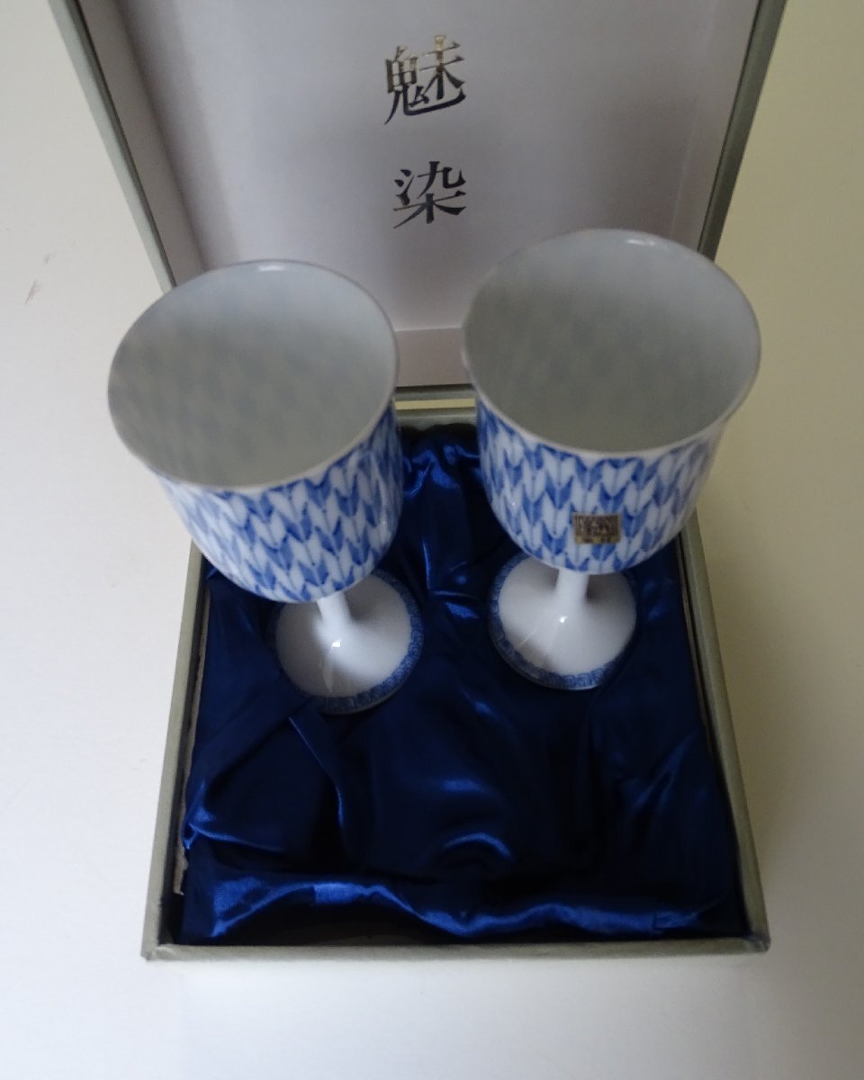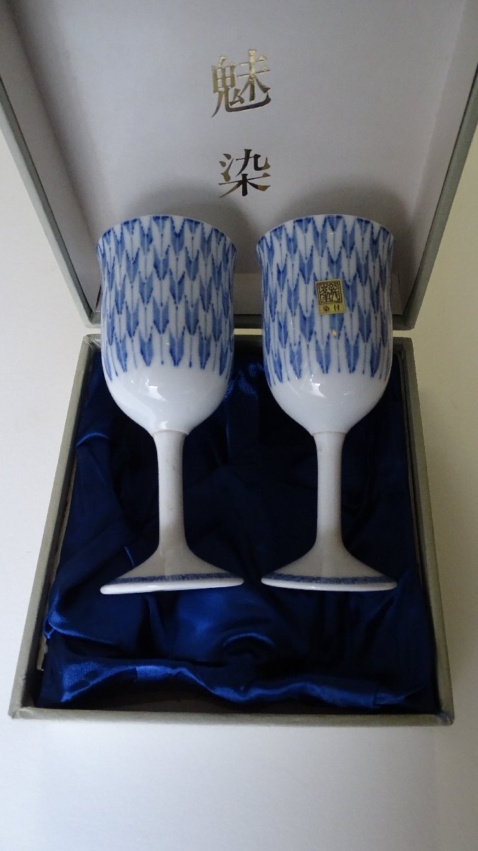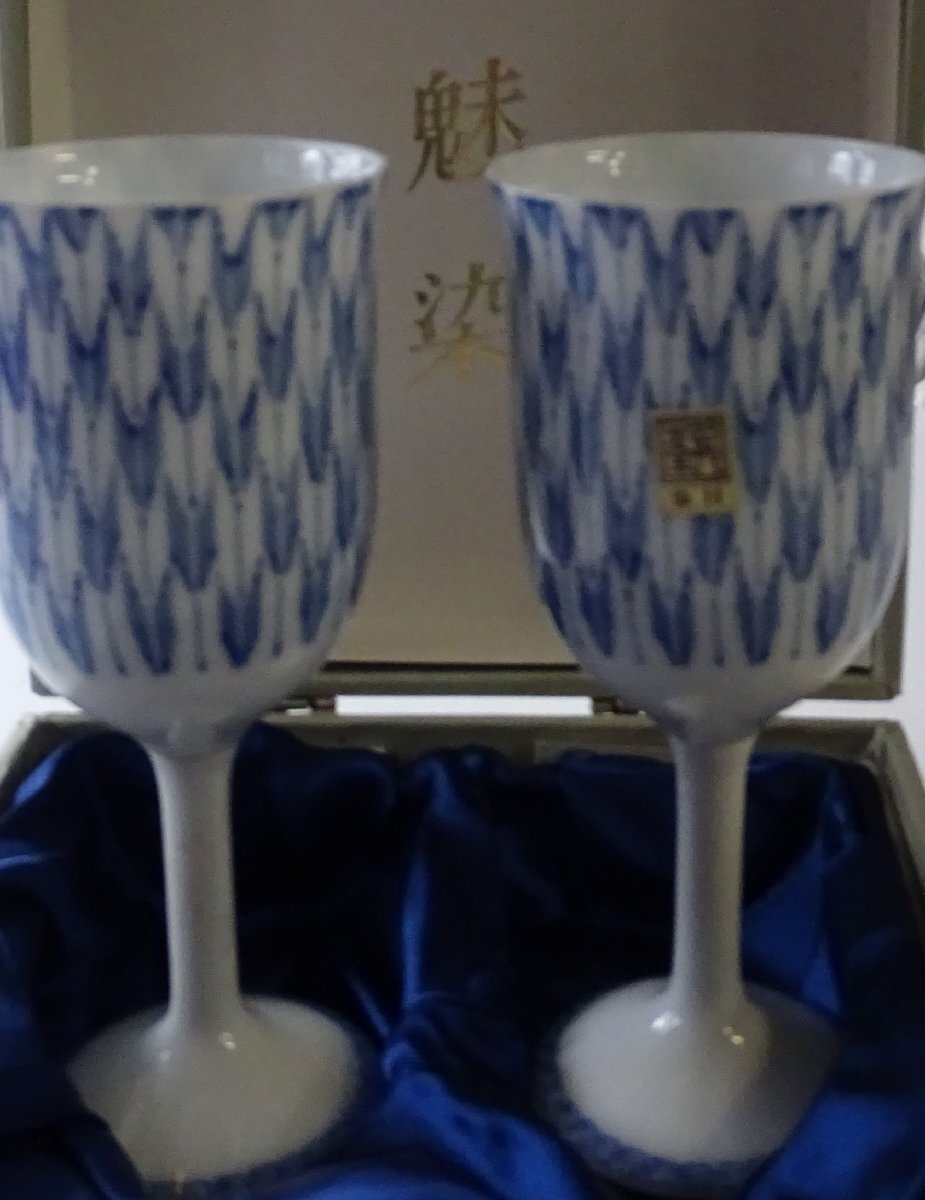 ・品名: 矢がすり絵ゴブレットペア ・技法: 魁染 ・窯元: 龍峰窯 三洋陶器類(株)・NO-R7-2-5.8