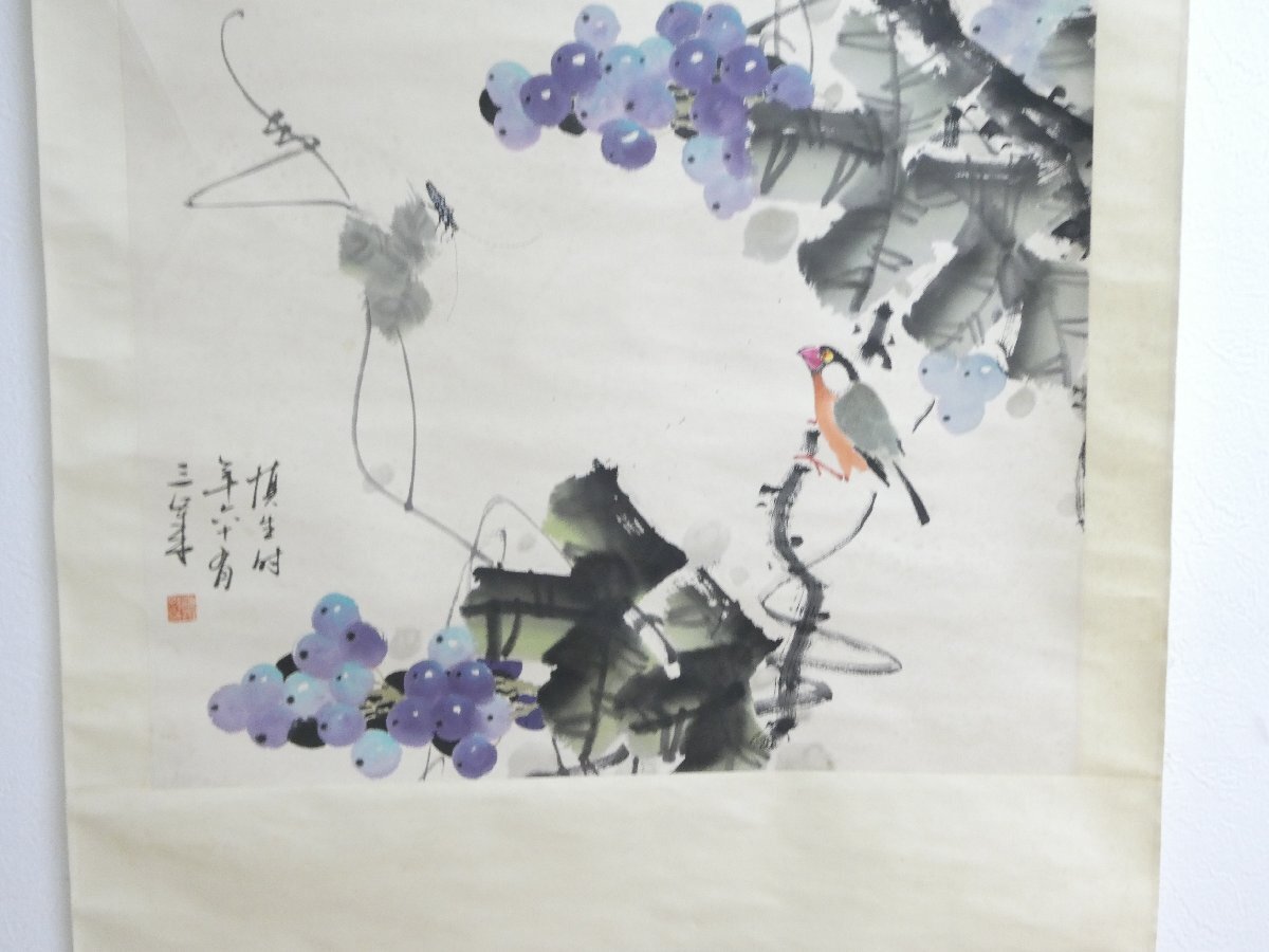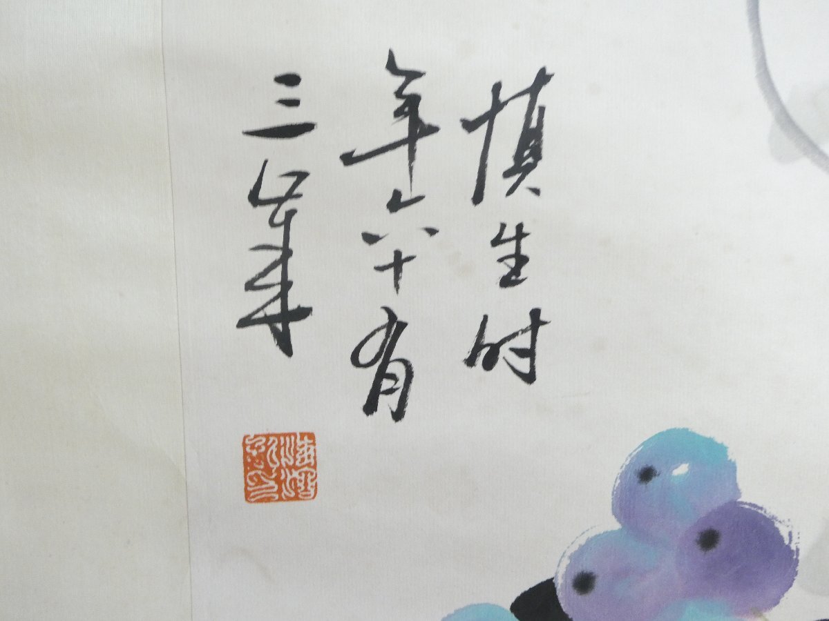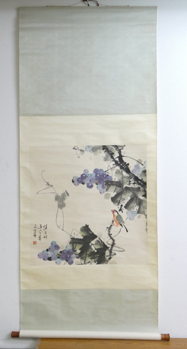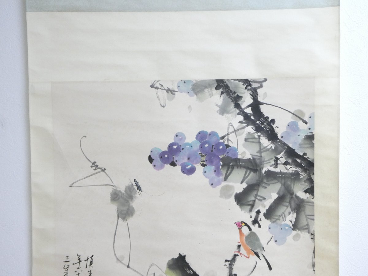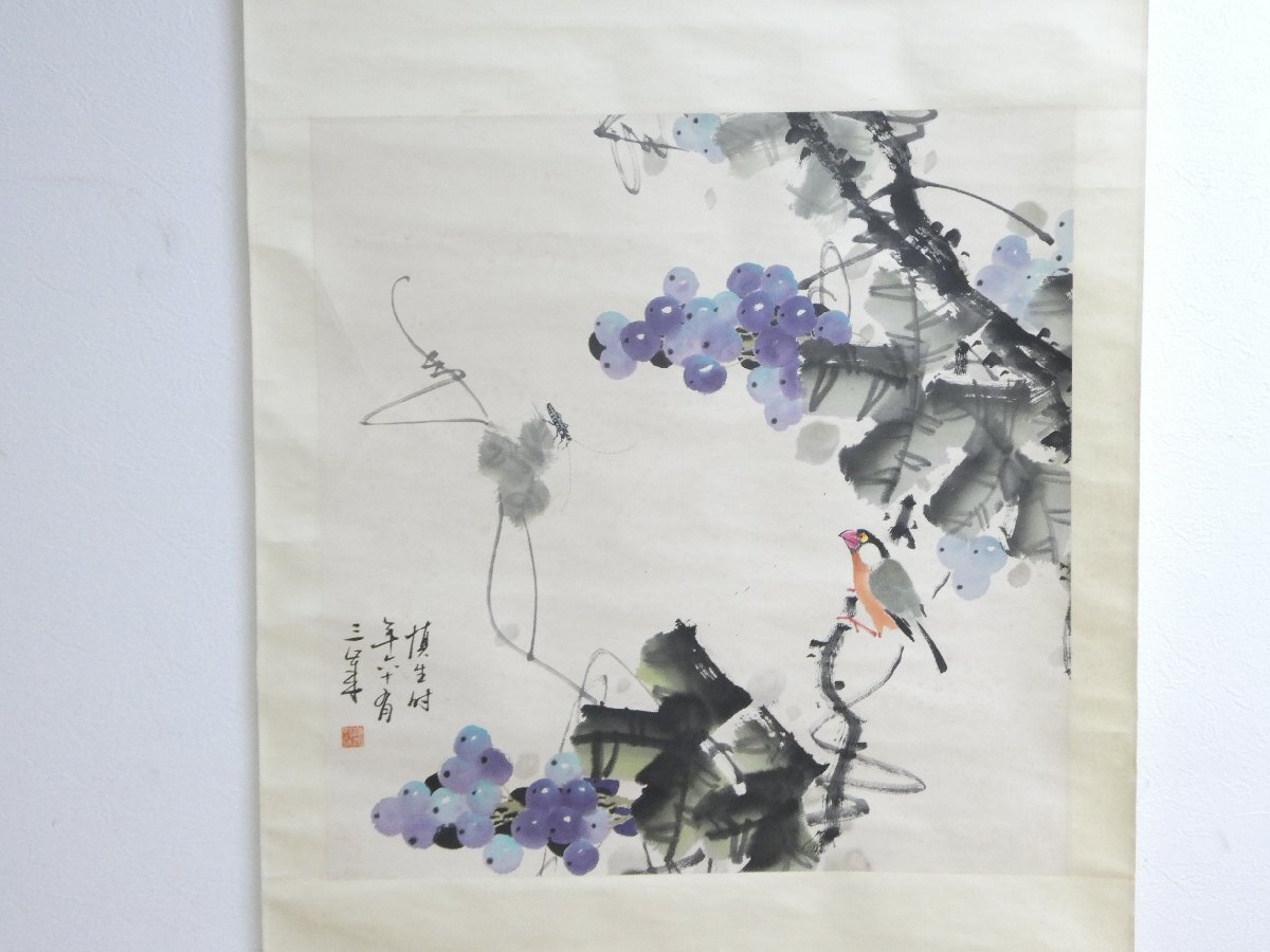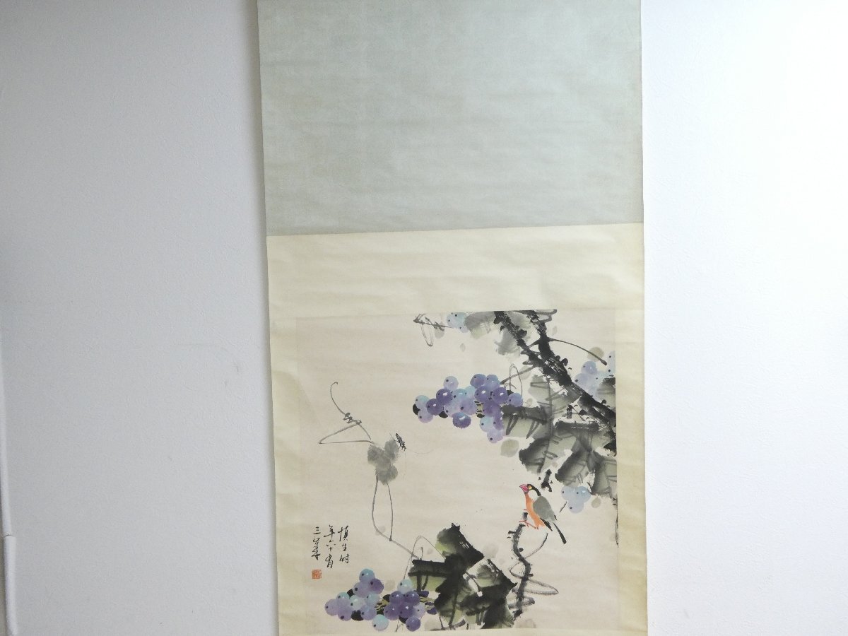 1202101 中国 掛軸 花鳥 葡萄 昆虫 印有