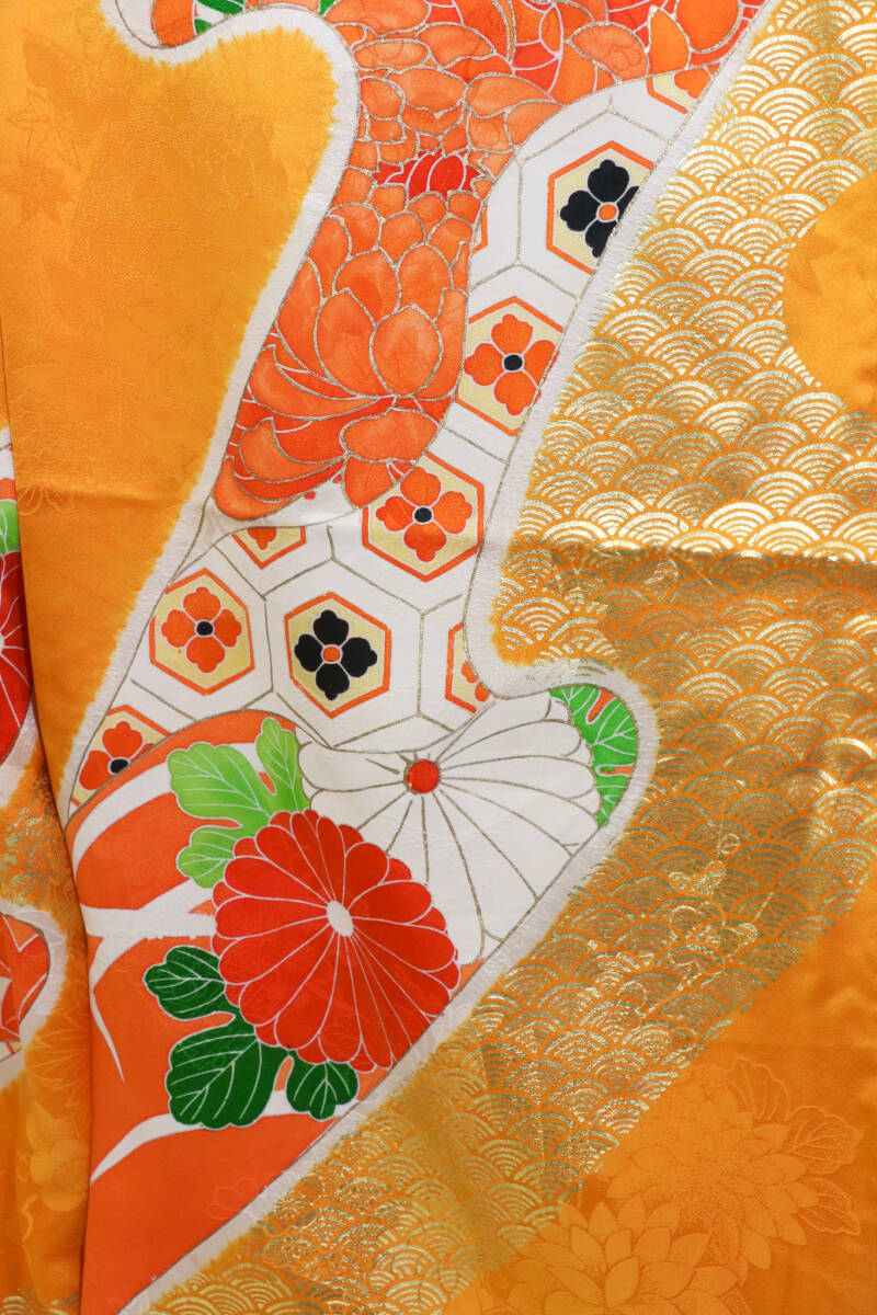 鮮やかなオレンジ地に大輪の菊文様と金彩が施された、非常に華やかな正絹振袖です。