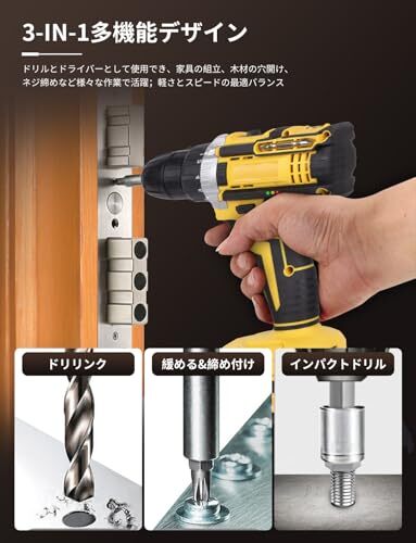 【21V高性能・コードレス電動ドライバーセット】電動ドリル、ドライバー、ネジ締めの3役をこなす多機能設計で、家具の組み立てや木材の穴開けなど幅広い作業に対応し、コードレス仕様に加え1.5Ahの大容量バッテリーを2個搭載しているため、電源がない場所でも長時間の連続作業が可能で、わずか1.2kg(バッテリー付き)の軽量設計により片手でも扱いやすく、女性でもDIY作業が快適に行えます。