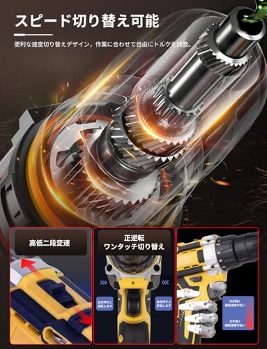 【正逆転ワンタッチ切り替え&安全ロック】 正逆転切り替えスイッチを使用することで、ネジ締め(正転)やネジ外し(逆転)の操作を簡単に行え、レバーを中央にするだけでスイッチがロックされ誤操作を防止します。さらに、自動ロックチャックを搭載しており、モーター作動中でもドリルビットが振動で外れる心配がなく、安全性と作業効率を同時に実現します。