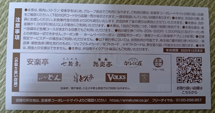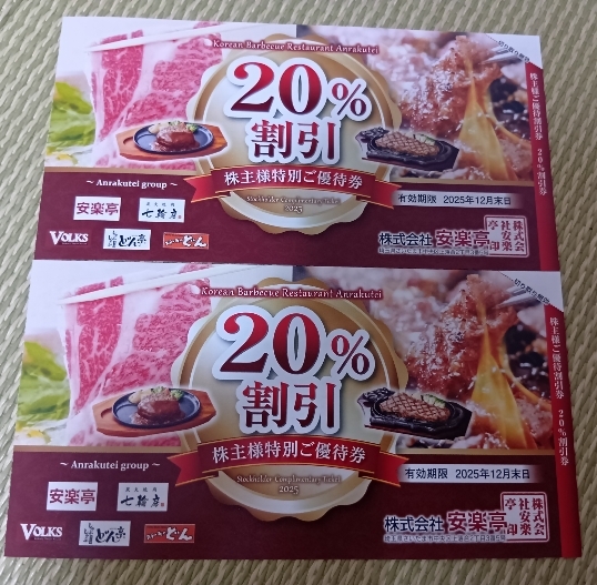 2枚セット 12/末 安楽亭 株主様特別ご優待券 20%割引券 送料0 七輪房 フォルクス VOLKS どん亭 ステーキのどん 焼肉 食事 クーポン 宴会