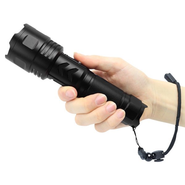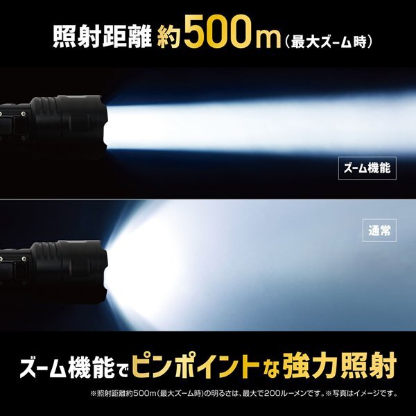 ズーム機能を使うと最大で約500m先まで照射できる懐中電灯。