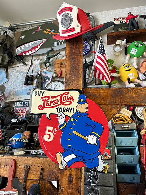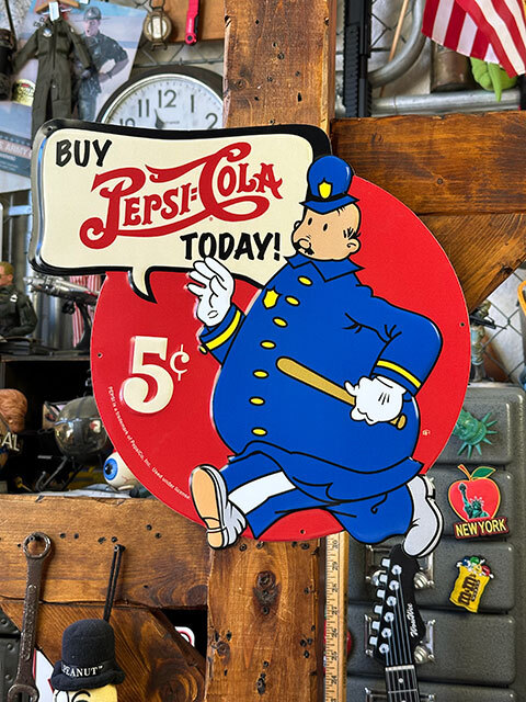 1930年代のペプシコーラの宣伝キャラクターを務めたポリスマンの「ピート」がエンボスティンサインになってるのを発見しました!