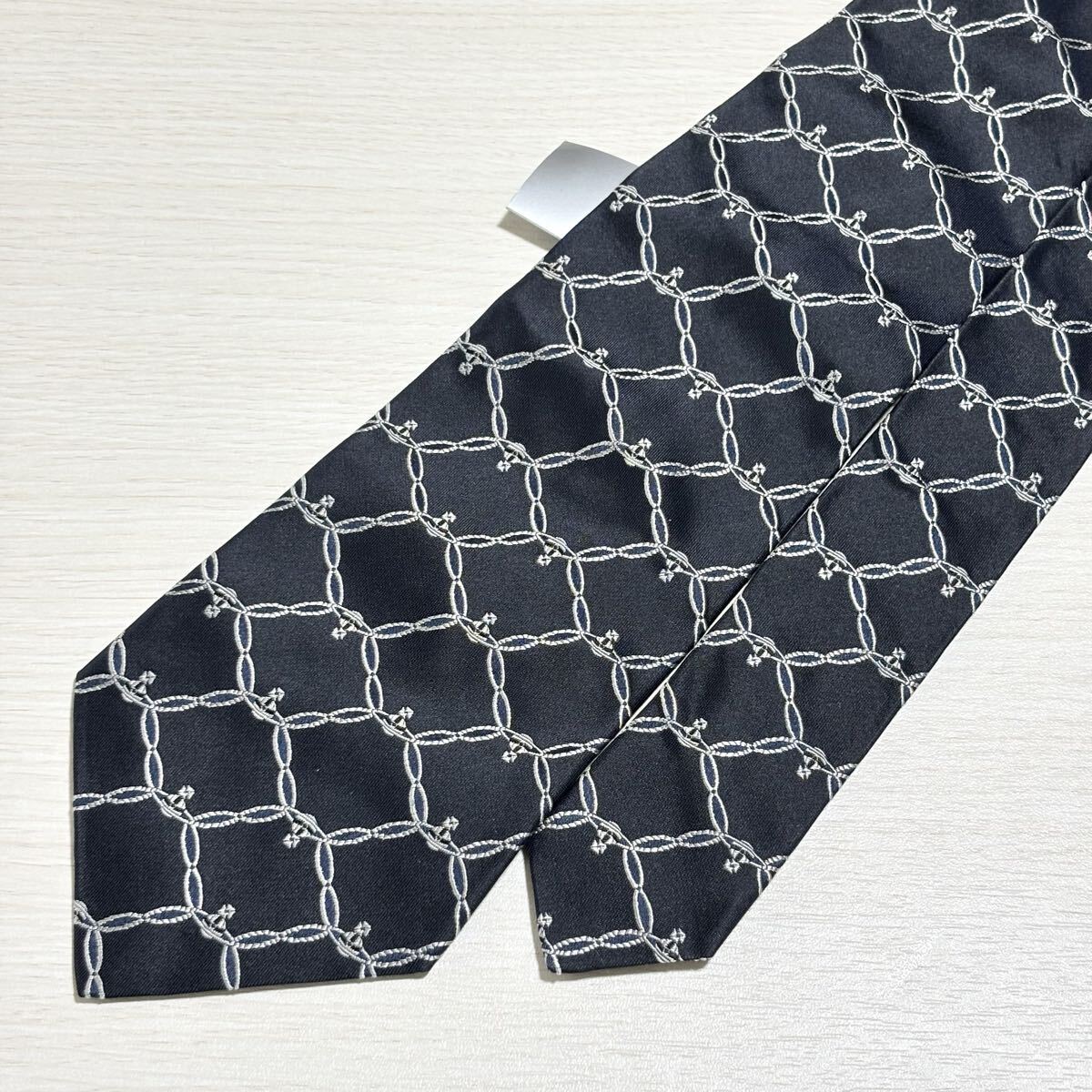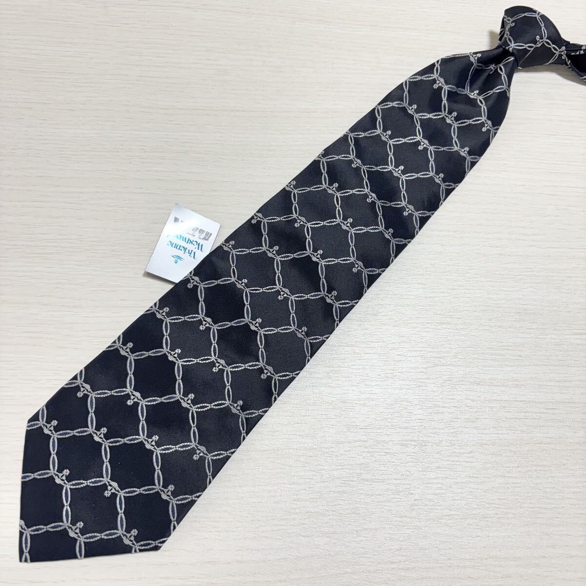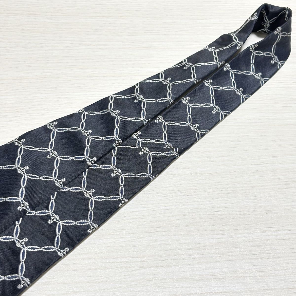 オーブロゴとチェーンパターンのVivienne Westwood MAN ヴィヴィアンウエストウッドマンのダークネイビーのネクタイ。新品未使用の状態。