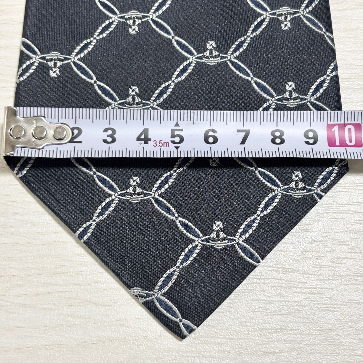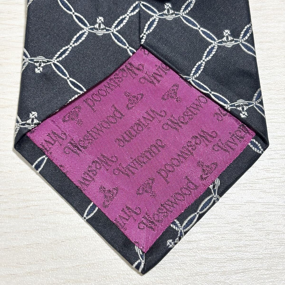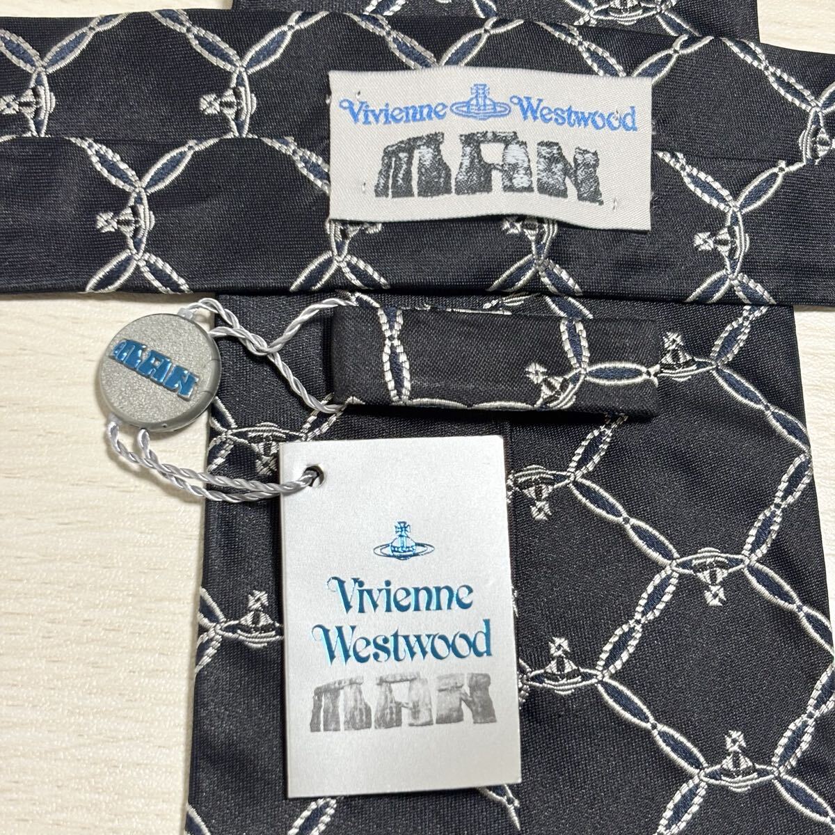 オーブロゴとチェーンパターンのVivienne Westwood MAN ヴィヴィアンウエストウッドマンのダークネイビーのネクタイ。新品未使用の状態。