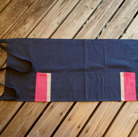 紺ブロード地にシルク縞のポケット付きカフェエプロン