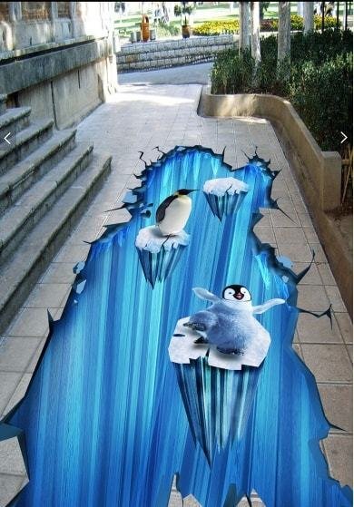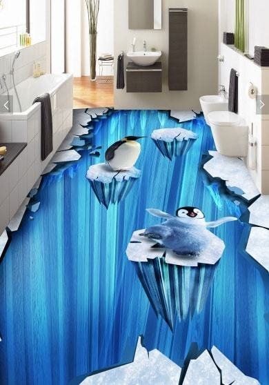 C414 巨大 3D フロアマット 1.2m*2m* 危険! 落とし穴 トリックアート 氷河 ペンギン 防音 断熱 滑り止めシート 床 壁 天井 はがせるシール
