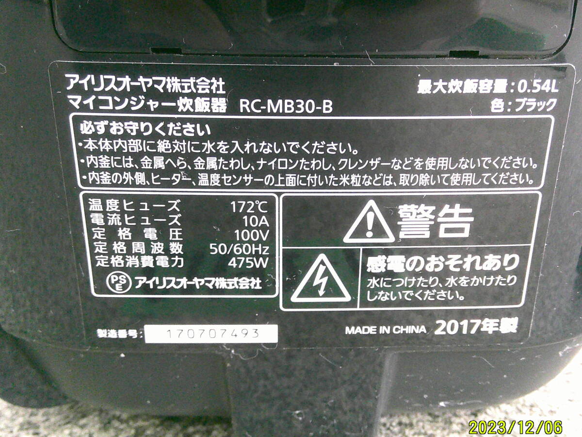 CH-12-18 アイリスオーヤマ マイコンジャー炊飯器3合炊き RC-MB30-B 2017年製 平日のみ直引取可