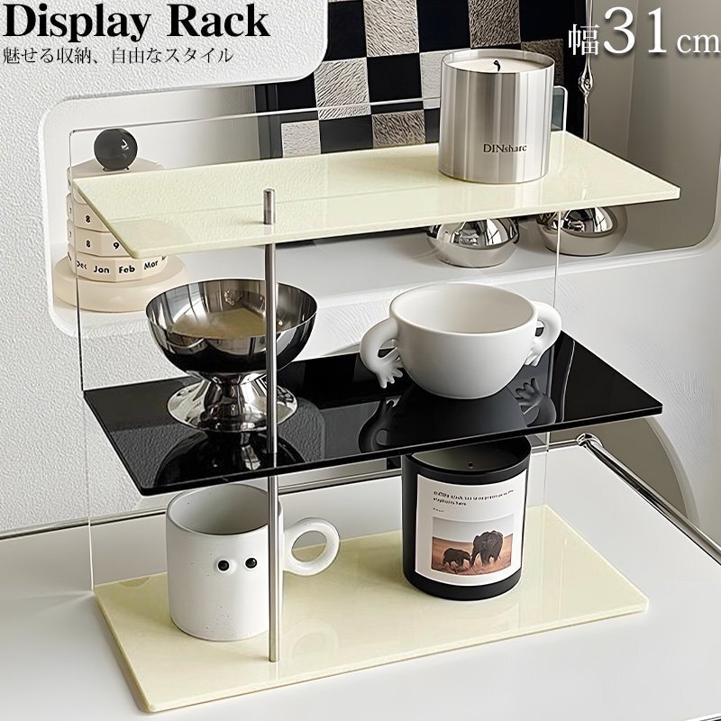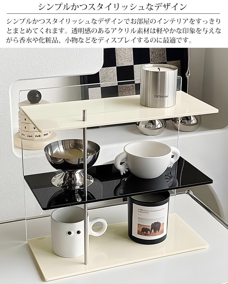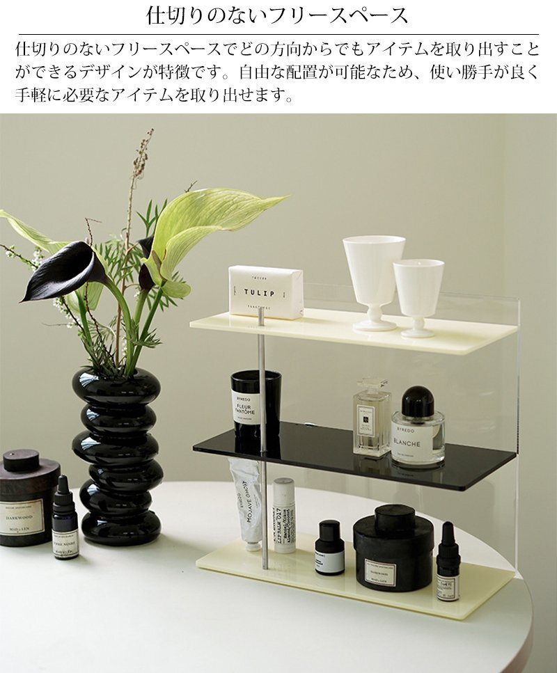![]() 3段アクリルラックはシンプルかつスタイリッシュなデザインで、お部屋のインテリアをすっきりとまとめてくれます。 透明感のあるアクリル素材は軽やかな印象を与えながら香水や化粧品、小物などをディスプレイするのに最適です。 ボトルやディフューザー、アクセサリーなどさまざまなサイズのアイテムを美しく整理整頓できます。 モダンなクロームメッキのフレームがアクセントとなり機能性とデザイン性を兼ね備えたラックです。 仕切りのないフリースペースでどの方向からでもアイテムを取り出すことができるデザインが特徴です。 自由な配置が可能なため、使い勝手が良く手軽に必要なアイテムを取り出せます。 化粧品や香水、アクセサリーなど、日常的によく使うものを収納するのに便利で視覚的にも開放感があるため、お部屋のインテリアをさらに洗練された印象にします。 ※本体にキズや汚れを防止する薄いフィルムが付いておりますので剥がしてお使いください。 カラー:ベージュ×ブラック×クリア サイズ(約):幅31cm×高さ29cm×奥行き14cm 重量(約):1.2kg 材質: 棚部分:アクリル 留め具:鉄 |