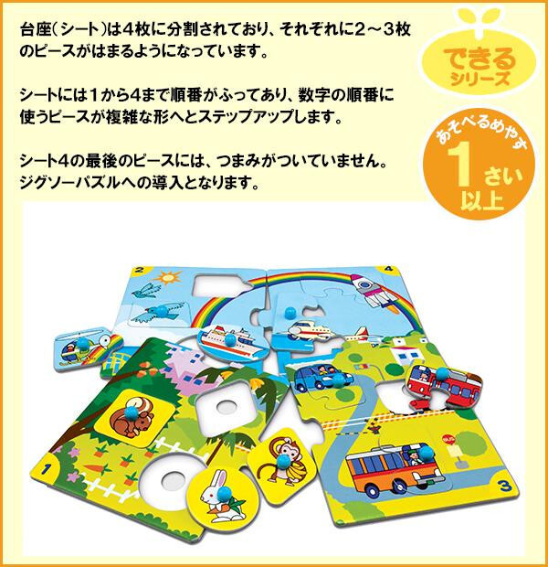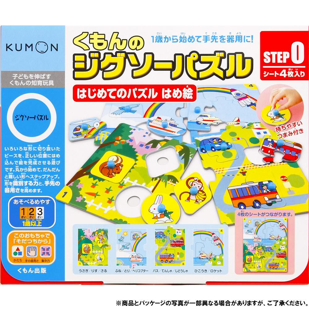 | 「くもんのジグソーパズル」シリーズの中で、もっともやさしい「はめ絵」のパズルのセットです。いろいろな形に切り抜いた、つまみがついたピースを正しい位置にはめ込んで絵を完成させる遊びで、手先の器用さ、形の認識力をはぐくみます。 |