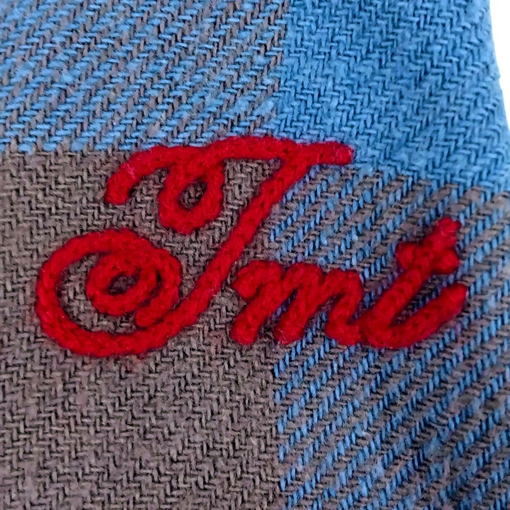 ユーズド品で着用感あり、ブロックチェック生地に毛羽立ちがあります。