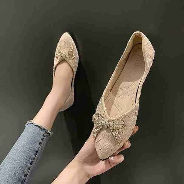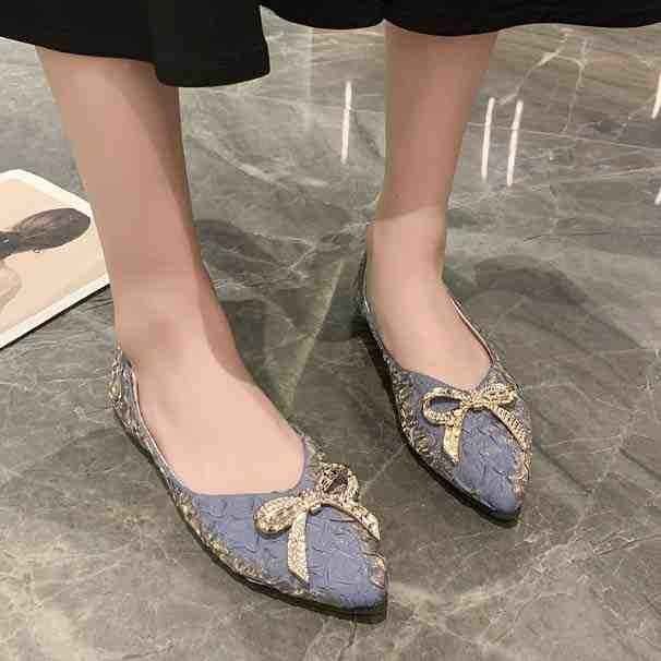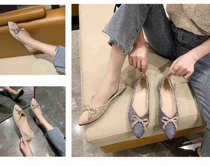 ・ポインテッドトゥデザインとアッパーに装飾があり脚がスッキリ見え。