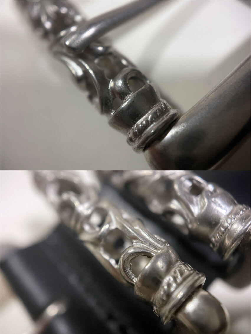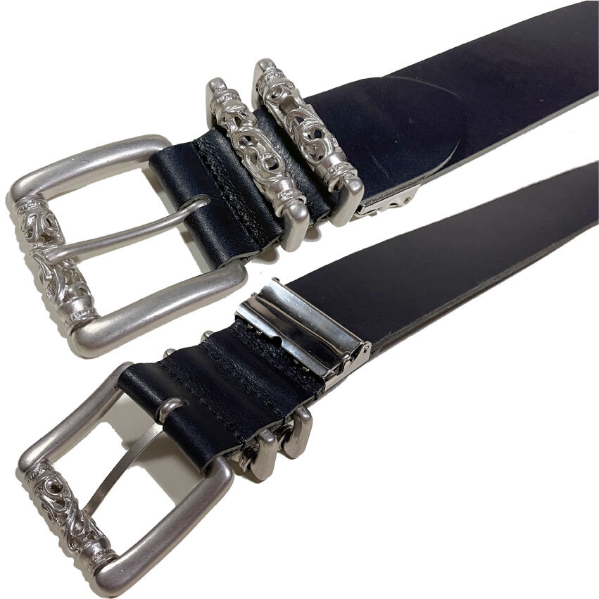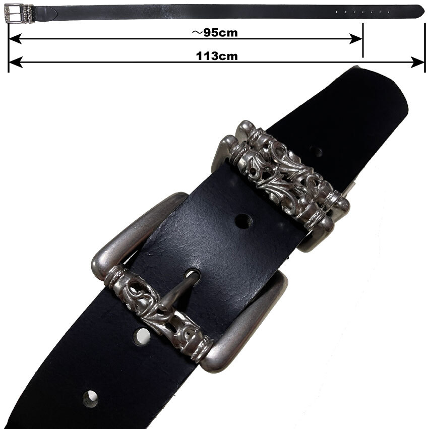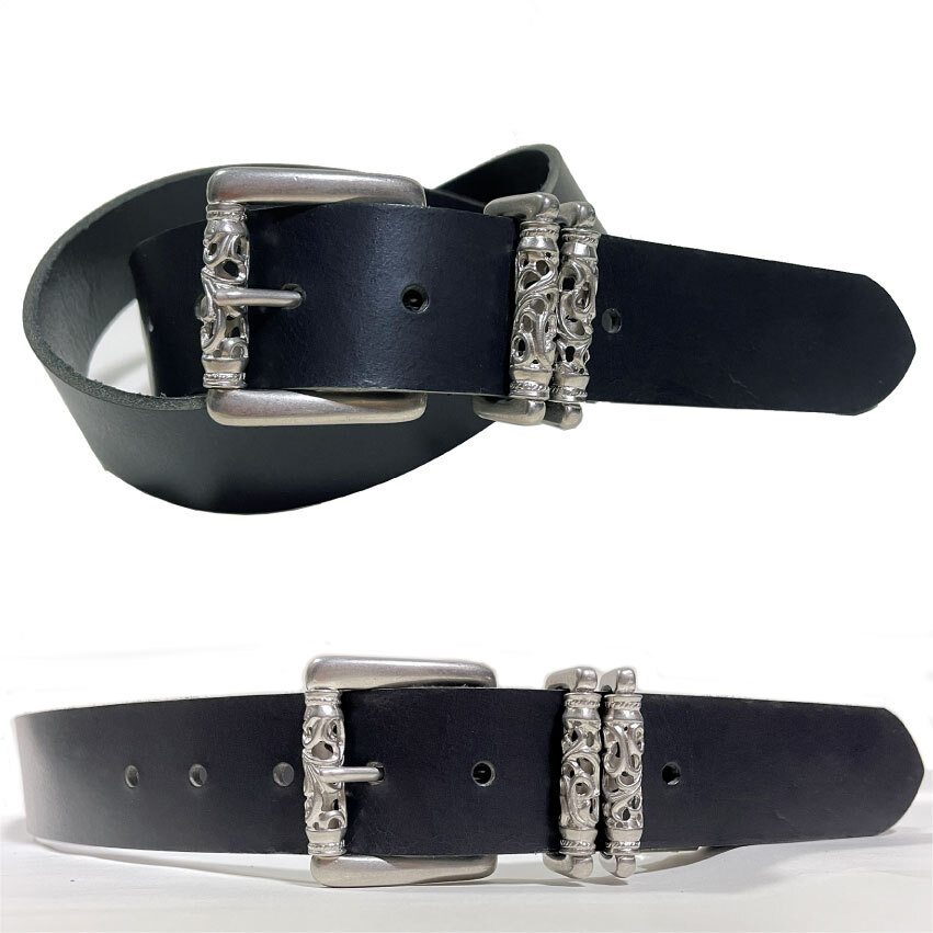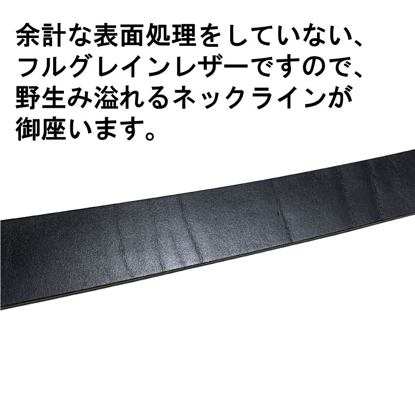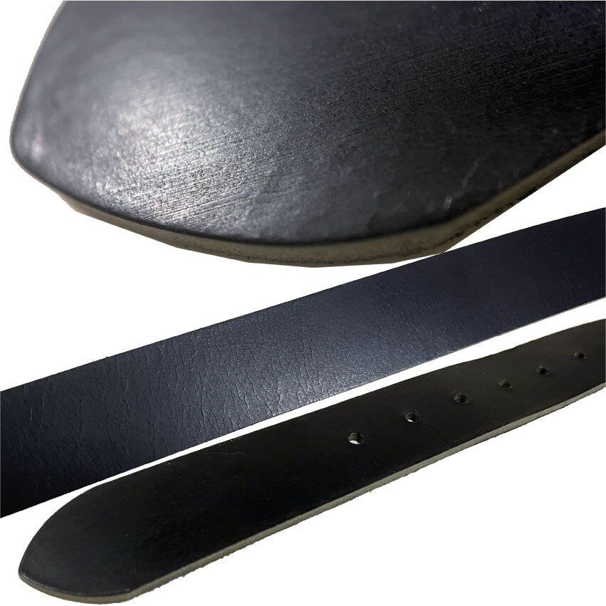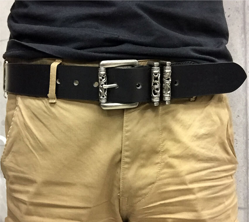 数量限定ですのでお見逃しなく。姫路レザーの1枚革(最厚部=4.0mm)を使用した40mm幅の国産ベルトです。クロムハーツを彷彿させるバックル&ループは、シルバー925では御座いません。銅と亜鉛の合金にメッキを施し、アンティーク加工したものです。ですが、ローラー部分の透かしなど、高い技術が要求されますので、メタルパーツの原価だけでも5,000円を超えます。姫路レザーは栃木レザー同様セレクトショップにて多数採用されている高級皮革で、その中でも肉厚な最高峰の物を使用致しております。Aランクの革を使用致しておりますが、フルグレインレザー(銀面付き革)ですので、画像では判別出来ない程度の凹凸や畝/色むら等がございます。8枚目の画像の通りショルダーレザー特有の味のあるネックラインも御座いますが、充分店頭販売レベルですし、本革らしい野性味溢れる逸品です。剣先部分を少し長めにしておりますので、アウトしたトップスから、少しバックルを覗かせるトレンドのウエアリングが可能です。日本の熟練した職人による手作りです。適度にオイルを含んだベジタブルタンニングレザーは粘りの有るシットリと吸い付く質感です。状態は新品です。バックル/メタルループは実物同様ローラー部分が回転致しますので、ストラップにストレスをかけません。またビンテージ加工が施されておりますので高級感があります。カラーは透明感の有るブラックです。ベジタブルタンニングレザーは、使い込む程に味が出てきますので、経年変化が楽しめます。カットによるサイズ調整が可能です。全長=113cmで、中心穴で着用の場合95cmくらいの方までに対応致します。
