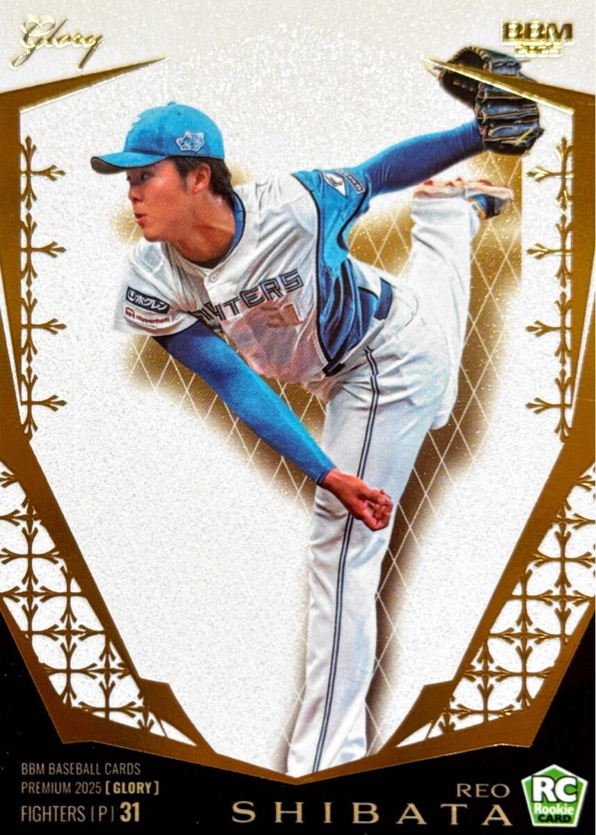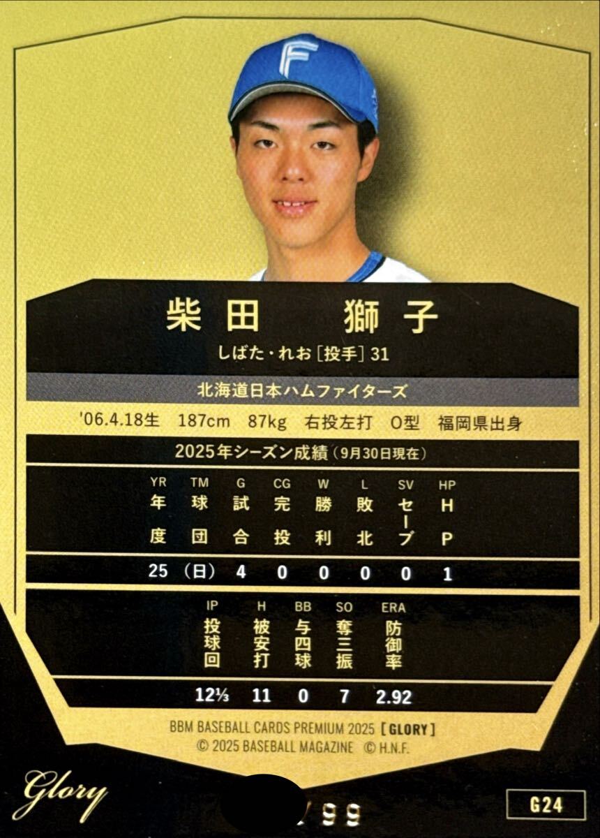 BBM 2025 GLORYに封入された北海道日本ハム 柴田獅子選手のレギュラーカード 金箔版です。99枚限定品です。