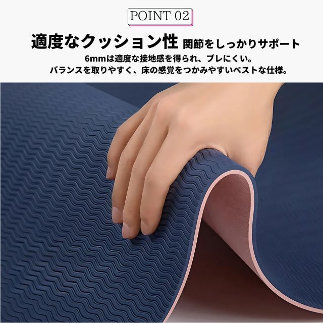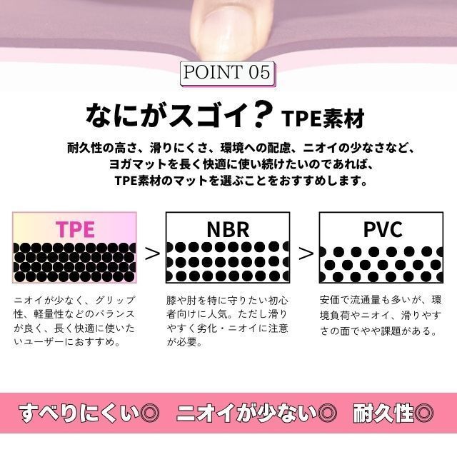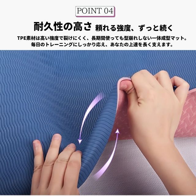 ご覧いただきありがとうございます。こちらは、エコ素材として注目される**TPE(熱可塑性エラストマー)**を使用したヨガマット(厚さ6mm)です。TPEはリサイクルが可能で、有害物質の混入が少ない場合が多く、環境や肌への負荷を抑えるため、ヨガやピラティスなどの運動を安心して行いたい方におすすめの素材です。一般的にゴム特有のニオイが少ないうえ、防水性と防滑性にも優れているため、汗や汚れがサッと拭き取れて、お手入れやメンテナンスも簡単に済ませられます。
