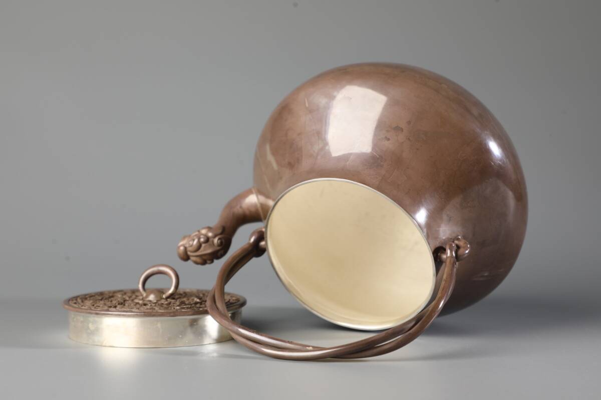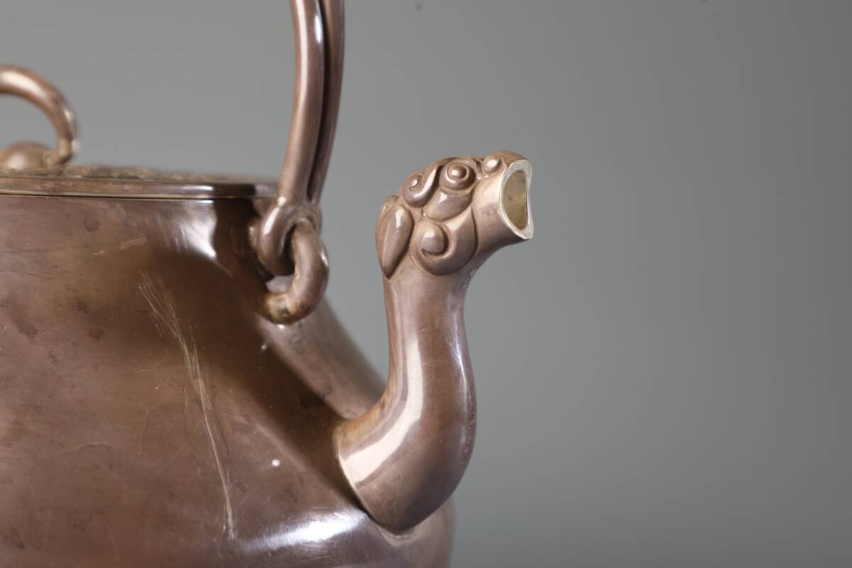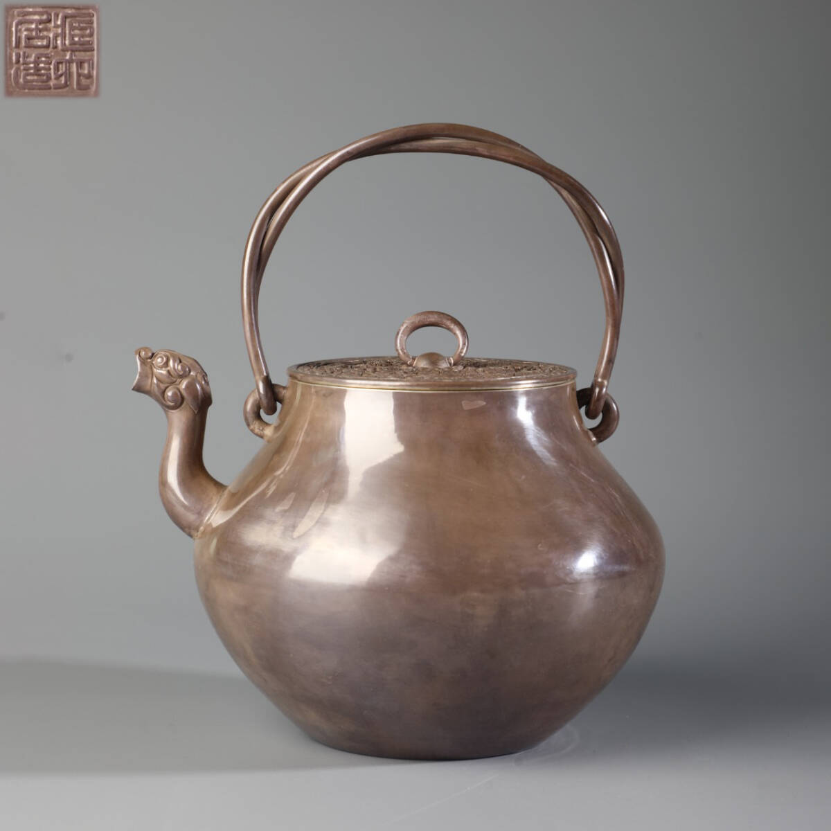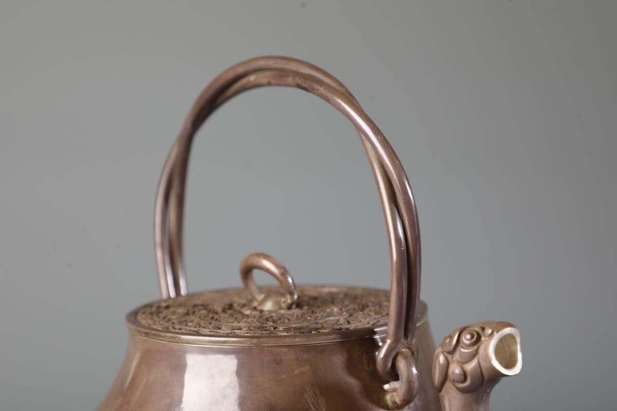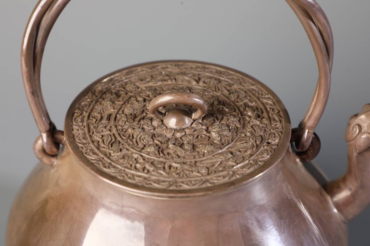 品名:純銀鏨刻瑞獸紋獸嘴提梁壺