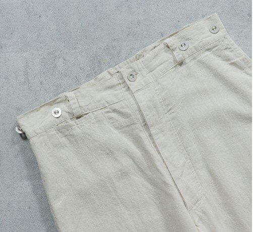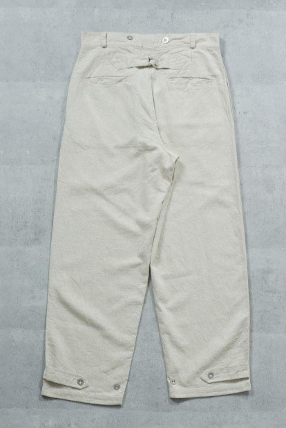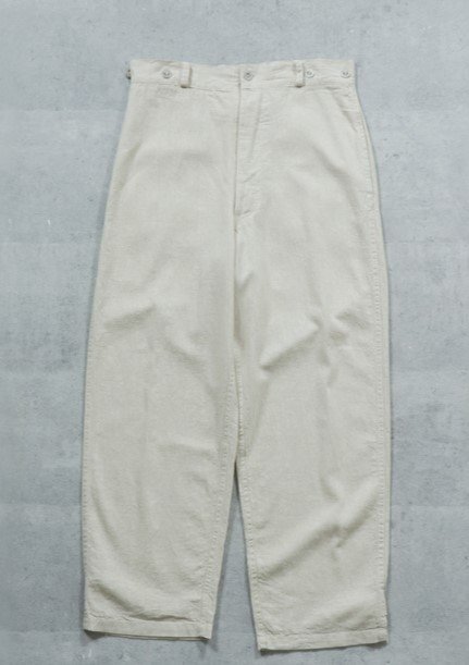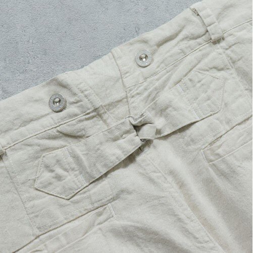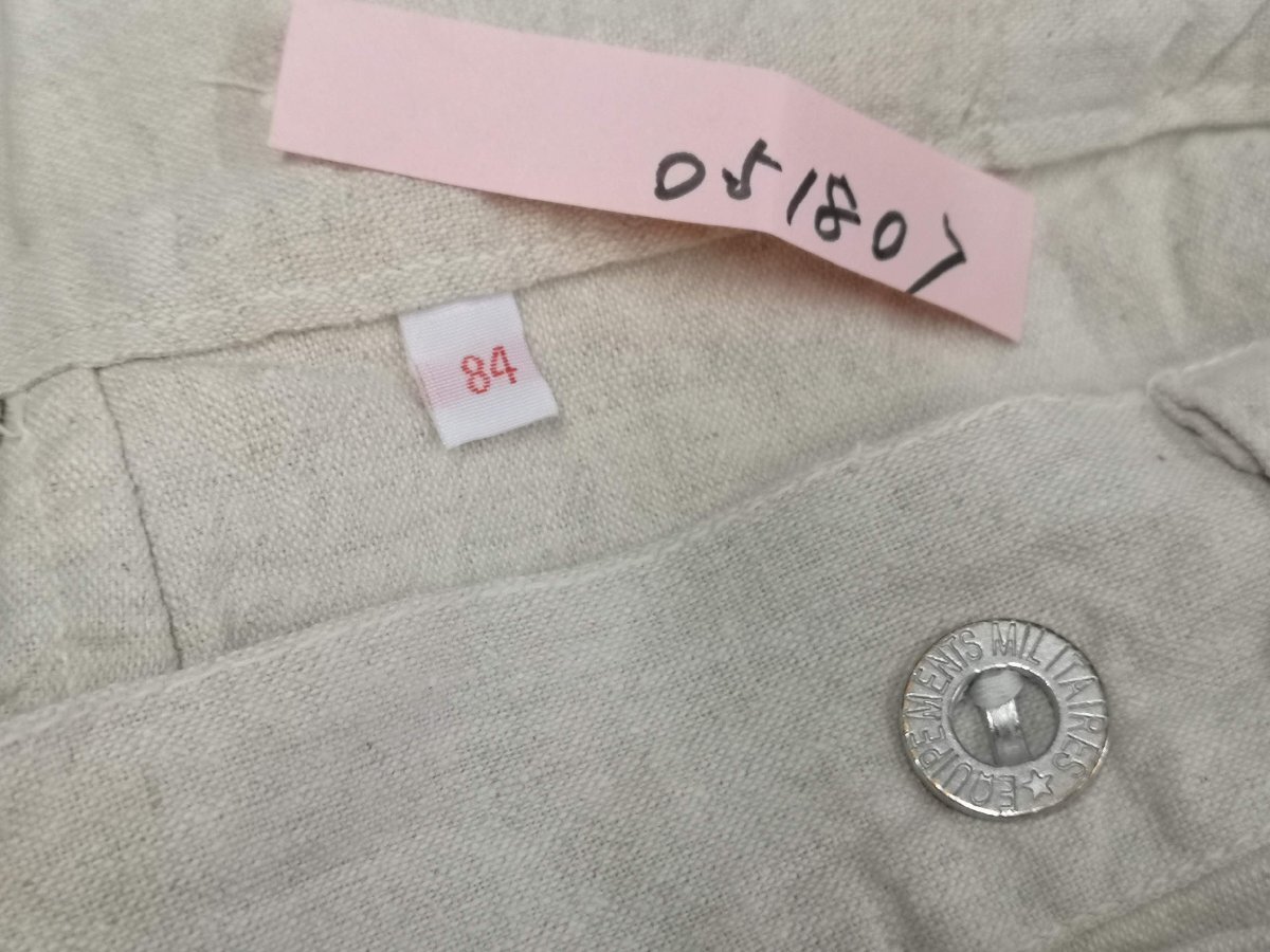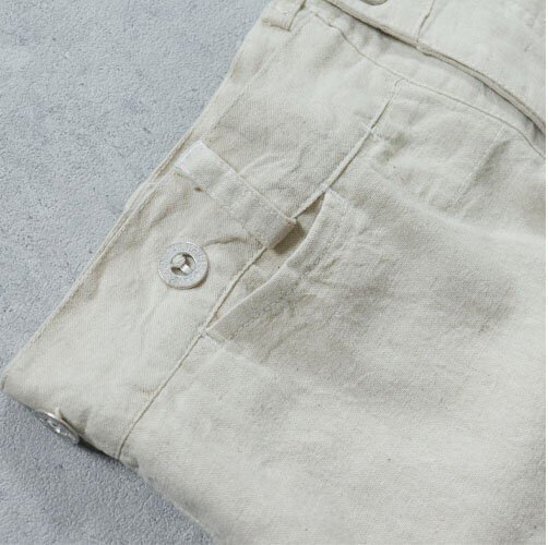 フランス軍でボージョンと呼ばれる被服は訓練・作業用に使用されていました。 イギリスやドイツのドリル、USのワーキング(デニム)に相当します。 ボージョンの原型は、1873年に採用された炊事兵用の作業着でした。 1882年からは訓練・作業着として全兵士に支給されました。 過酷な使用環境に耐えるため、頑丈な無漂白のリネン生地が採用され刻印入りの合金ボタンを使用しました。 全体的にゆったりとしたシルエットでシンチバックでフィット感を調整できました。1912年には 歩兵にも支給されるようになりました。 その後改良が続けられましたがこのモデルは1940年代のものをモチーフにしています。 ●素材: リネン55% コットン45% サイズ84Mはウエスト84cm/総丈103cm/股下70cm程度です。 ※ワンウォッシュ、タンブラー乾燥をしております。生地の特性上、ウエストサイズに若干のバラつきがございます、ご了承ください。 沖縄離島を除く全国元払い500円でお送りいたします。落札価格にプラスでお願いします。