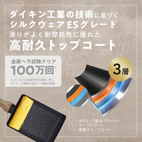 | こびり付きにくく汚れがスルっと落ちる! 熱伝導率の高い卵焼きフライパン。 |