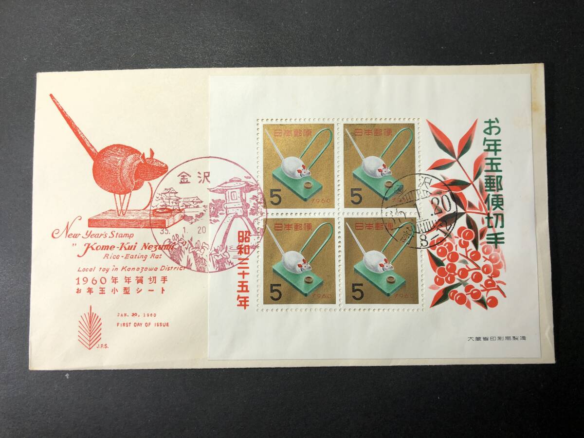 ★FDC 初日カバー★年賀切手 昭和35年用 「米食いねずみ」 小型シート張 J.P.S版 昭和35年発行 Y9712
