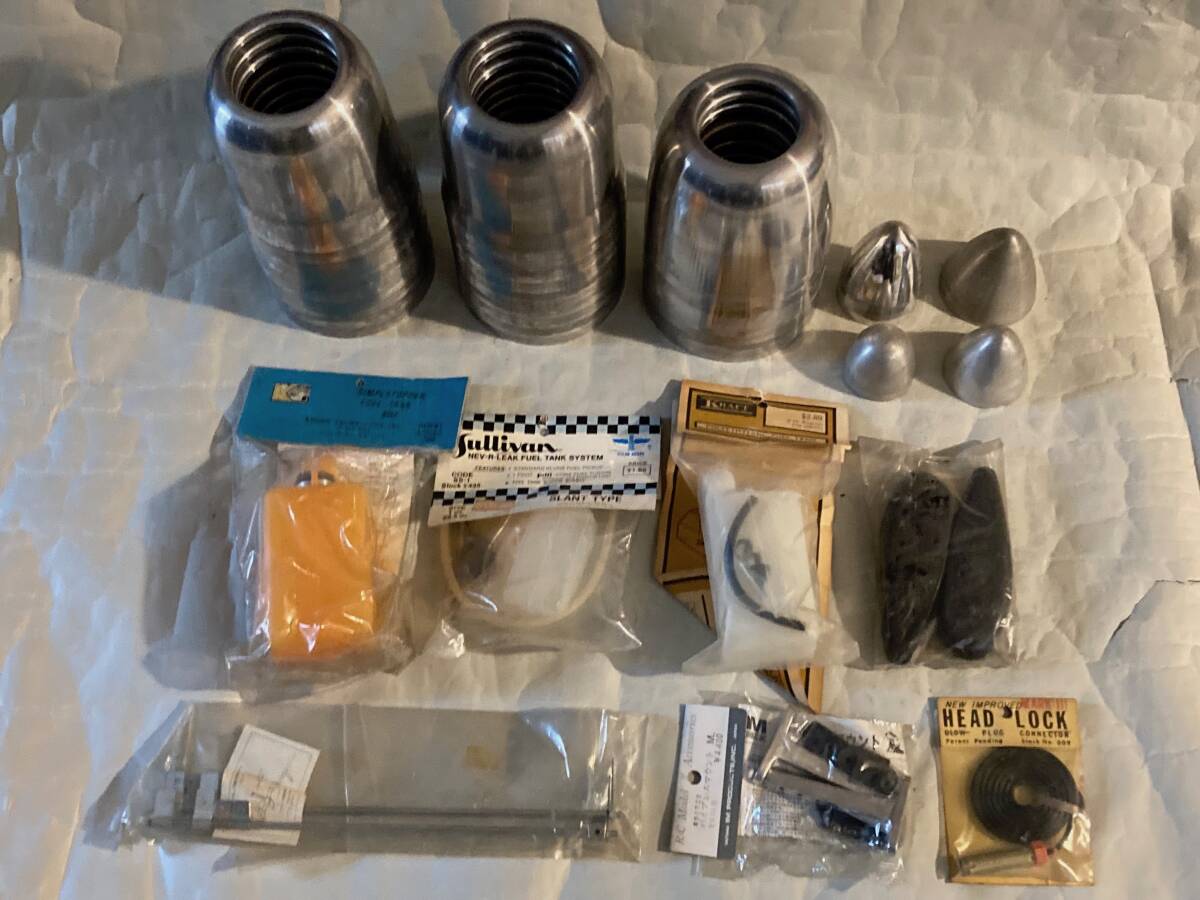 貴重!古い U コンやラジコン用のアルミカウル 2種 28個、燃料タンク 3個、スピンナー 7個他。