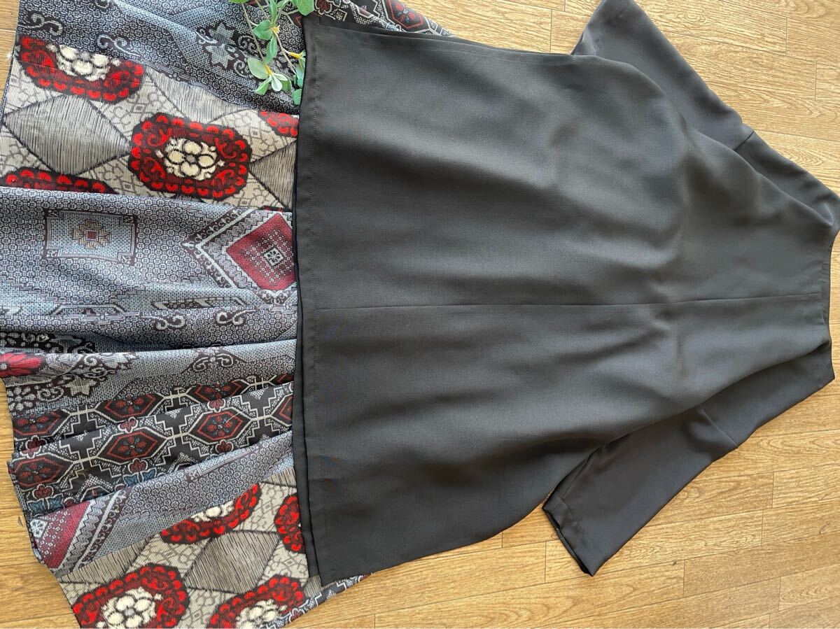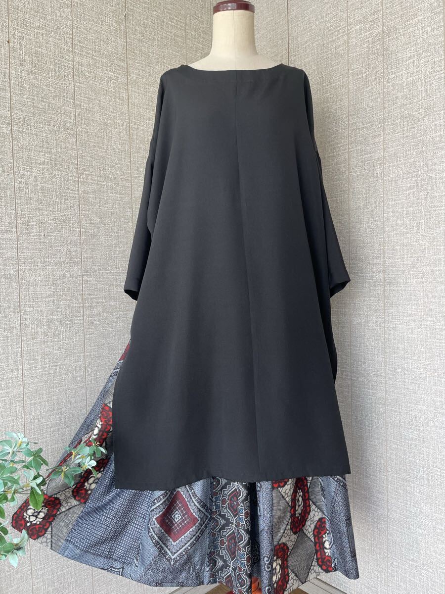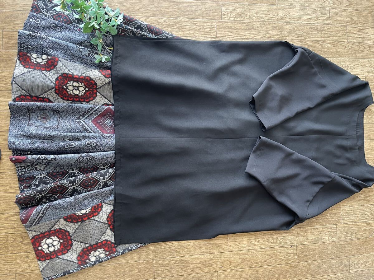 パッチワークギャザースカートとチュニック(黒紋付)のセットアップです。