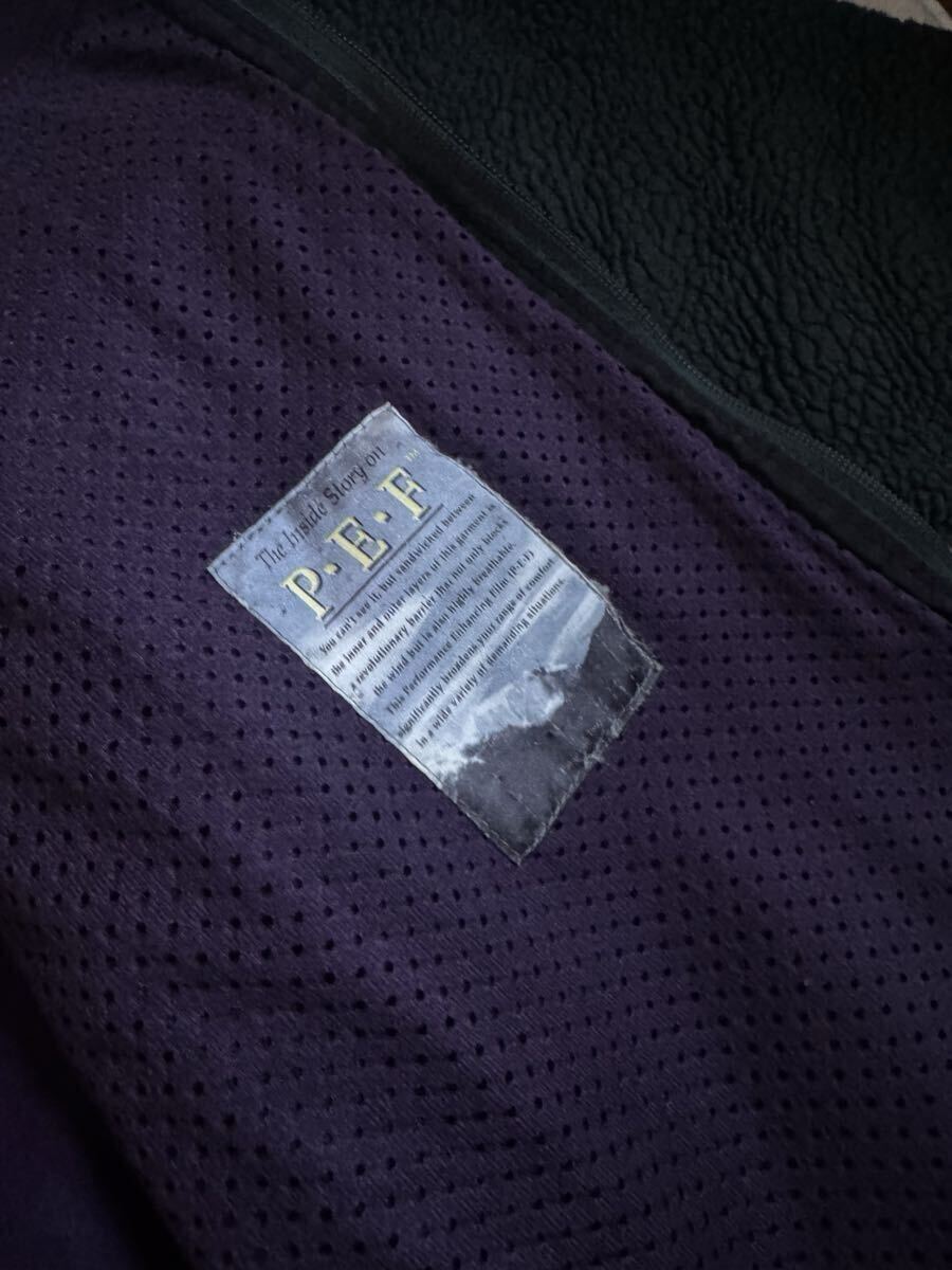 内側についているPEFは性能強化フィルム(Performance Enhancing Film)の事であり、1990年代のPatagonia製品に採用されていた、防風性・透湿性を高めるための特殊フィルムや技術を指します。