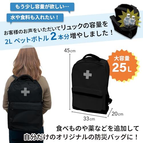 【大容量の防災リュック】お客様から「もっとたくさん物を入れたい」とのお声をいただき、ペットボトル2本分大きくなりました。あらかじめ入ってる物に、水や食料など自分に必要なものをプラスして自分だけの防災バッグに。