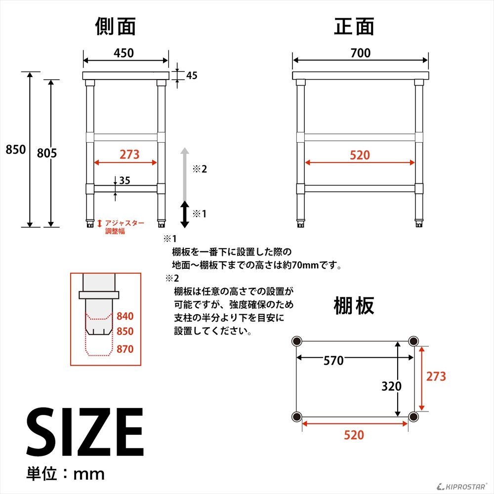 | 材質 | 天板:ステンレスSUS430 脚:ステンレスSUS201 梁:スチール アジャスト脚:ステンレスSUS201/PVC |