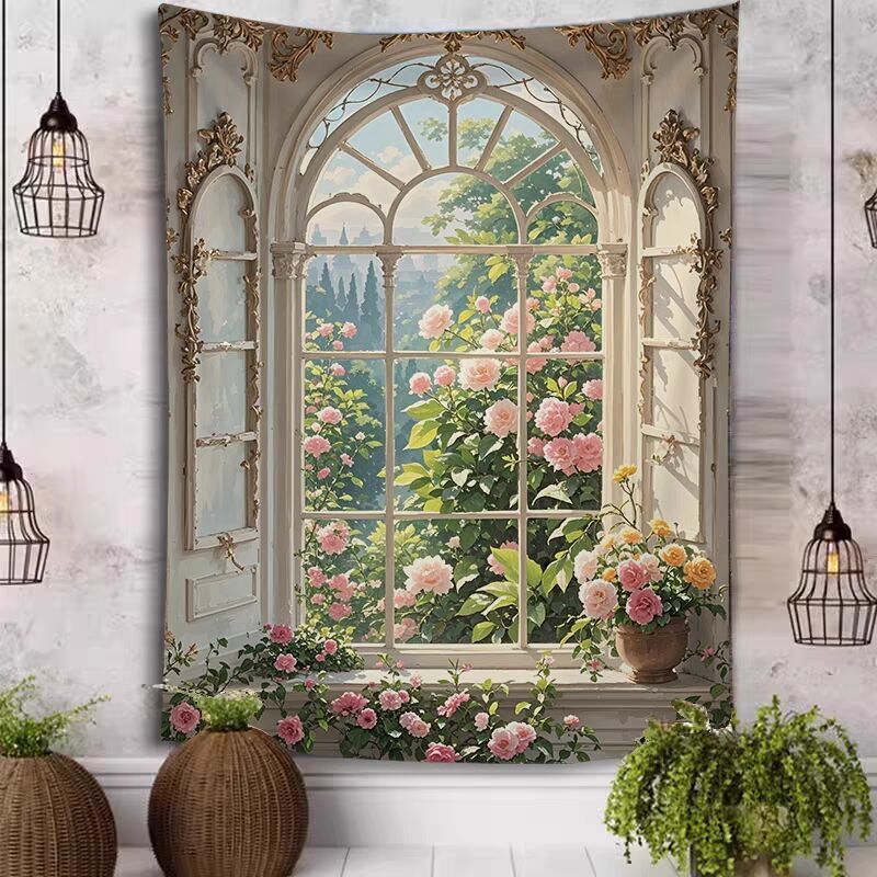 タペストリー 壁飾り 壁掛け装飾布 布ポスター 部屋飾り 背景布 インテリア カーテン 洋風窓と花々の絵柄 70x100cm