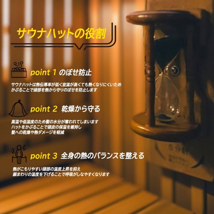 サウナハットは熱伝導率が低く、室温が高くても熱くなりにくいため、かぶることで頭部を熱から守り、のぼせを防止する役目を果たしてくれます。