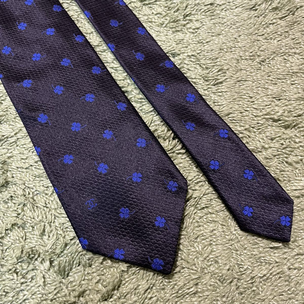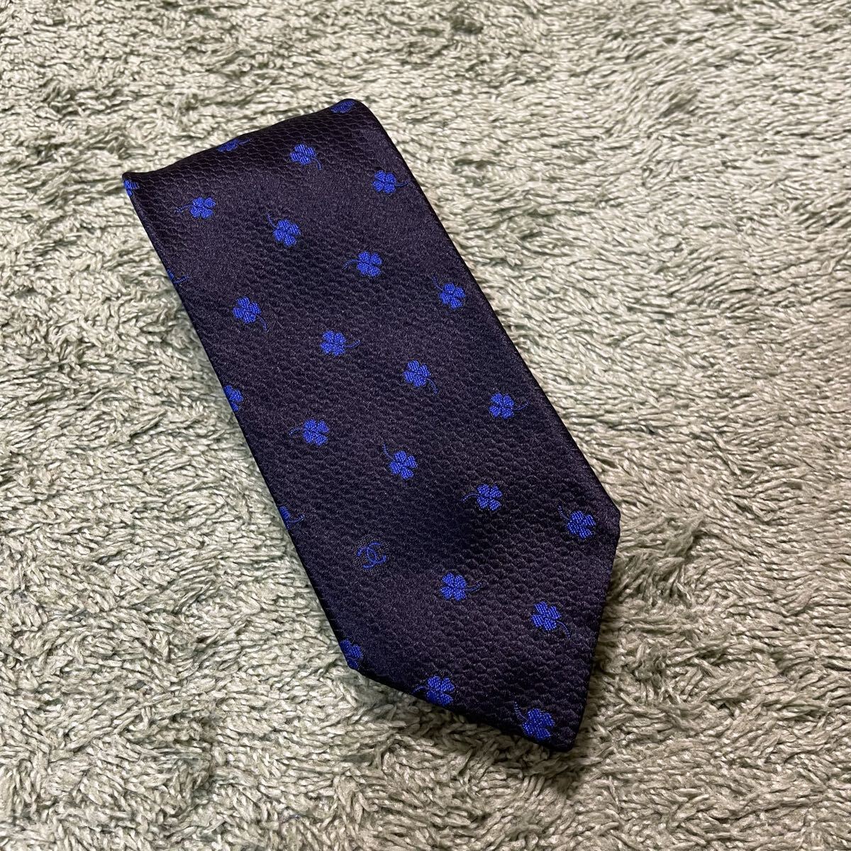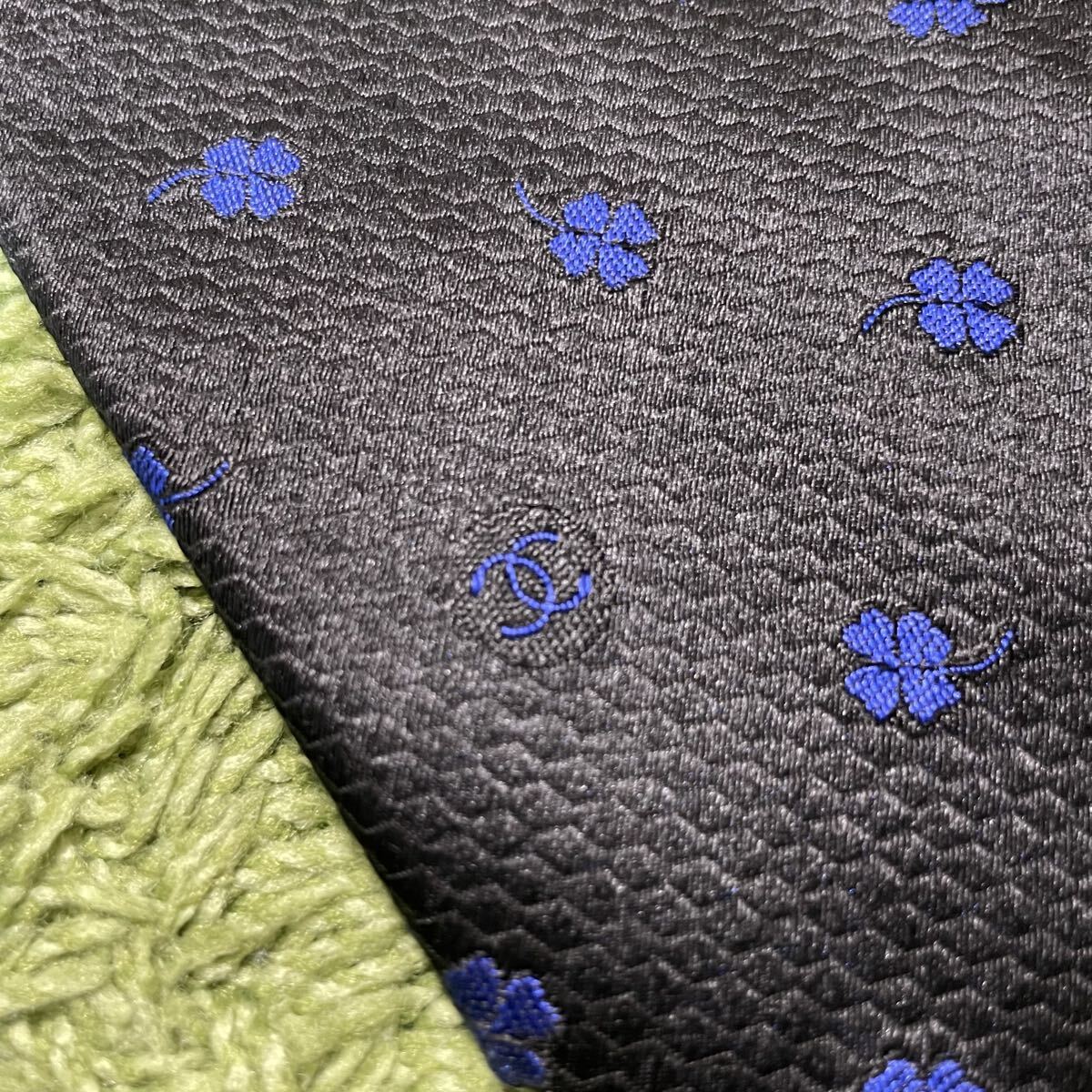 1円スタート! 未使用級 CHANEL シャネル ココマーク クローバー 総柄 シルク100 ネクタイ ブラック イタリア製 ビジネス レギュラータイ